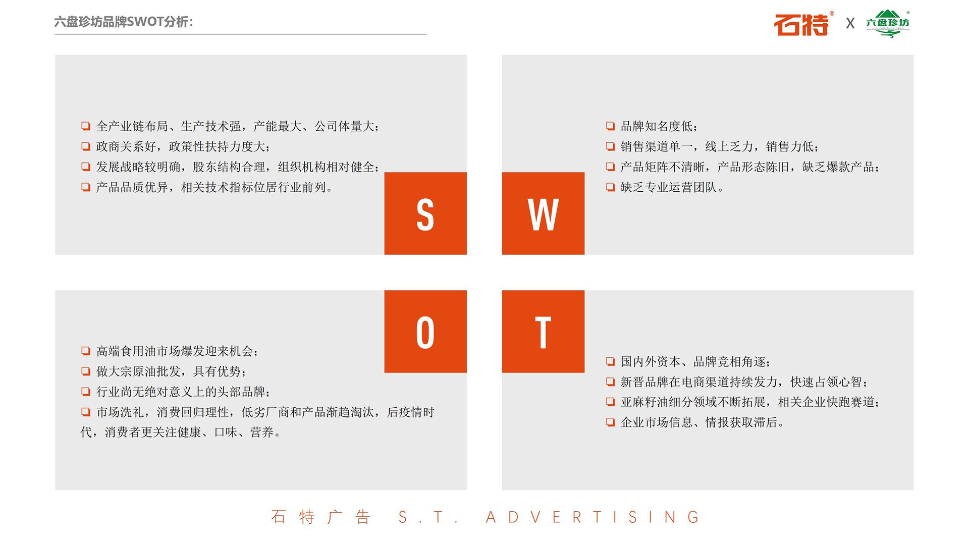 石特廣告在進行實地考察時,走訪了亞麻花的種植地、生產廠區、辦公區域,并查閱了相關資料,分析得出了六盤珍坊的目標市場、品類趨勢、市場形態和競爭環境,并結合對品牌的SWOT分析,梳理并聚焦了企業目前存在的問題。