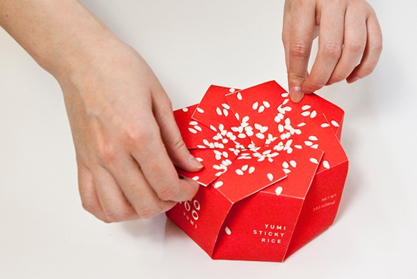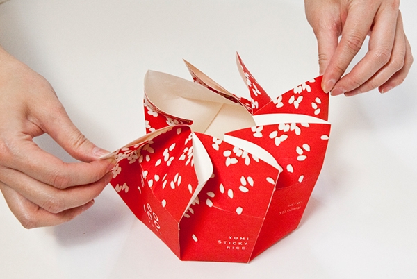 Yumi飯團選用含有豐富的礦物質元素的黑龍江水稻為原料,健康無添加劑。品牌的標志設計是一種手繪的圖案,與產品自然健康的理念相協調。食品包裝設計采用可回收利用的紙質異形包裝,造型獨特新穎,與普通商家的產品包裝產生明顯的差異,包裝造型統一便于消費者記憶。食品包裝展開后近似荷葉形狀,給人一種近距離接觸自然地感覺。包裝色彩上主要采用黑白紅三色,紅色是中國傳統顏色,黑色代表東北黑土地上,白色則指新鮮潔白的大米,它們共同傳達著產品自然健康的理。