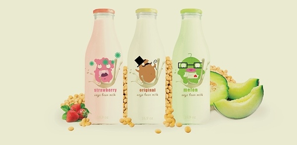 兒童食品或飲料包裝通常非常漂亮。 SoyMilk脫穎而出,因為開發了3款可愛的水果口味豆漿包裝,它提供了簡單和清晰的趣味插畫圖案,可愛的水果人物,組成這個豆漿包裝的核心畫面。