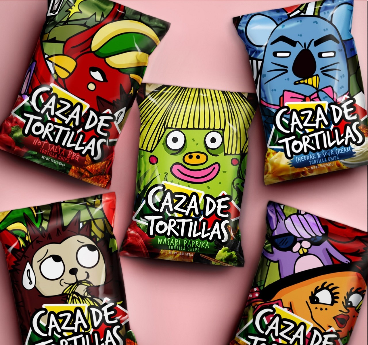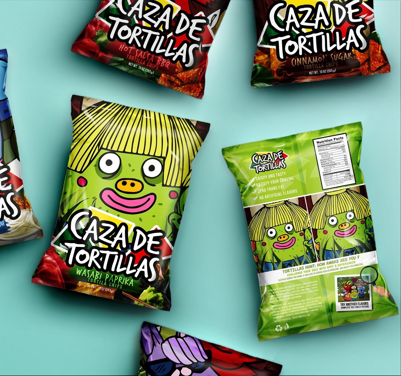 新的小吃包裝是一個有趣和創新的設計。它必須有一些個性,才能成為該類別的領導者,該設計將吸引所有年齡段的人們,被孩子和大人所喜愛。包裝共分為5種不同的口味。我們在零食包裝設計之初,給小吃做了細分的人群定位,并且研究他們的消費生活及購物習慣, 把千禧一代作為目標市場,因為他們往往比老一輩要鐘情小吃。食品是他們社會生活的重要組成部分。千禧一代的銷售渠道比其他年代多,并且傾向于以“即時消費”博取他們的眼球,他們更擅長用智能手機,在線研究和購買產品,網絡購買是他們主要的渠道。