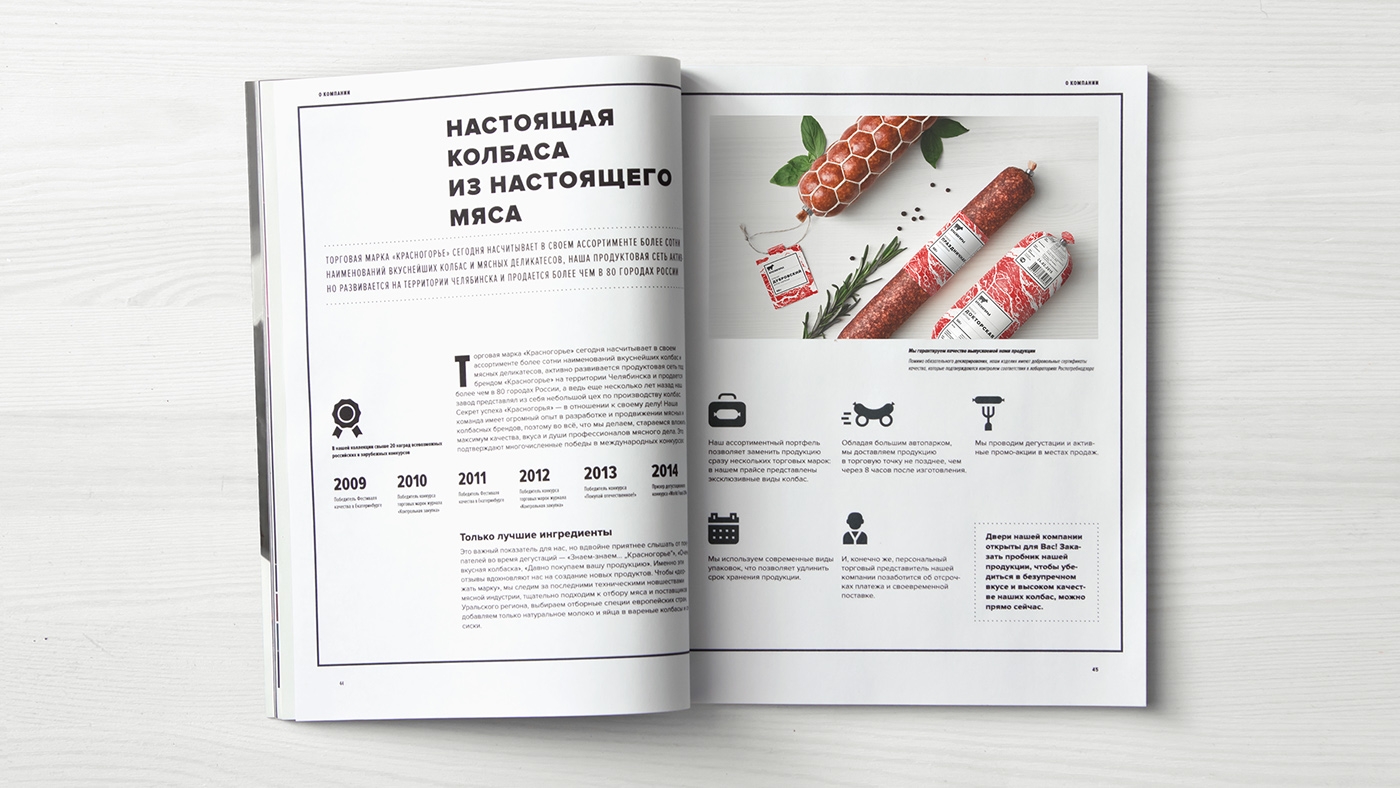 Krasnogorie的信息和宣傳材料根據與產品標簽相同的簡單規則組成。ascetic布局包含了一些微妙的圖形元素,如黑框、虛線分隔線和點象形圖,說明了公司及其產品的優勢。使用這些元素,我們實現了組合的多樣性,同時保持單一布局結構。