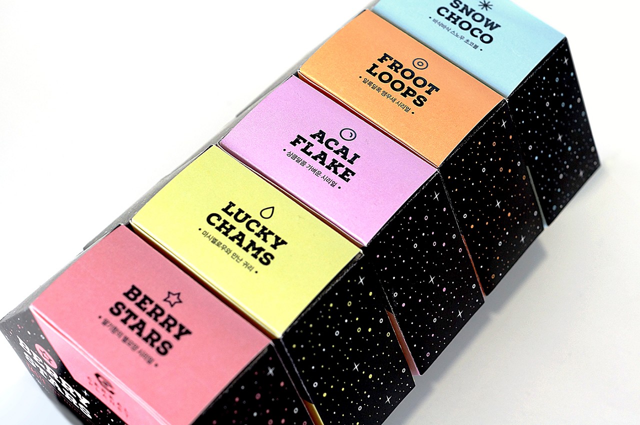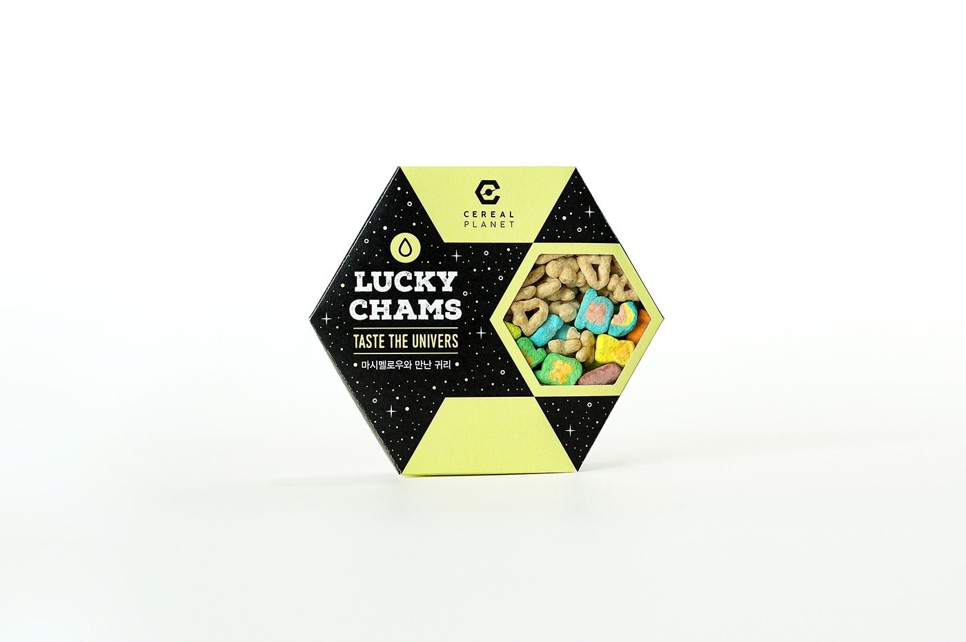 我們設計六邊形的包裝盒,包裝盒上同樣有個六邊形的窗口,方便消費者查看。品牌共有五種搭配的產品,以五種活潑的包裝顏色作區分,我們的想法是以一餐的包裝出售產品,讓消費者可以嘗試不同的口味。當六邊形的盒子組合在一起的時候,就顯示了星形的隱藏形狀,當堆加的足夠多是,就是一個繁星點點的黑色宇宙,你可以腦補一下,貨架上的宇宙。