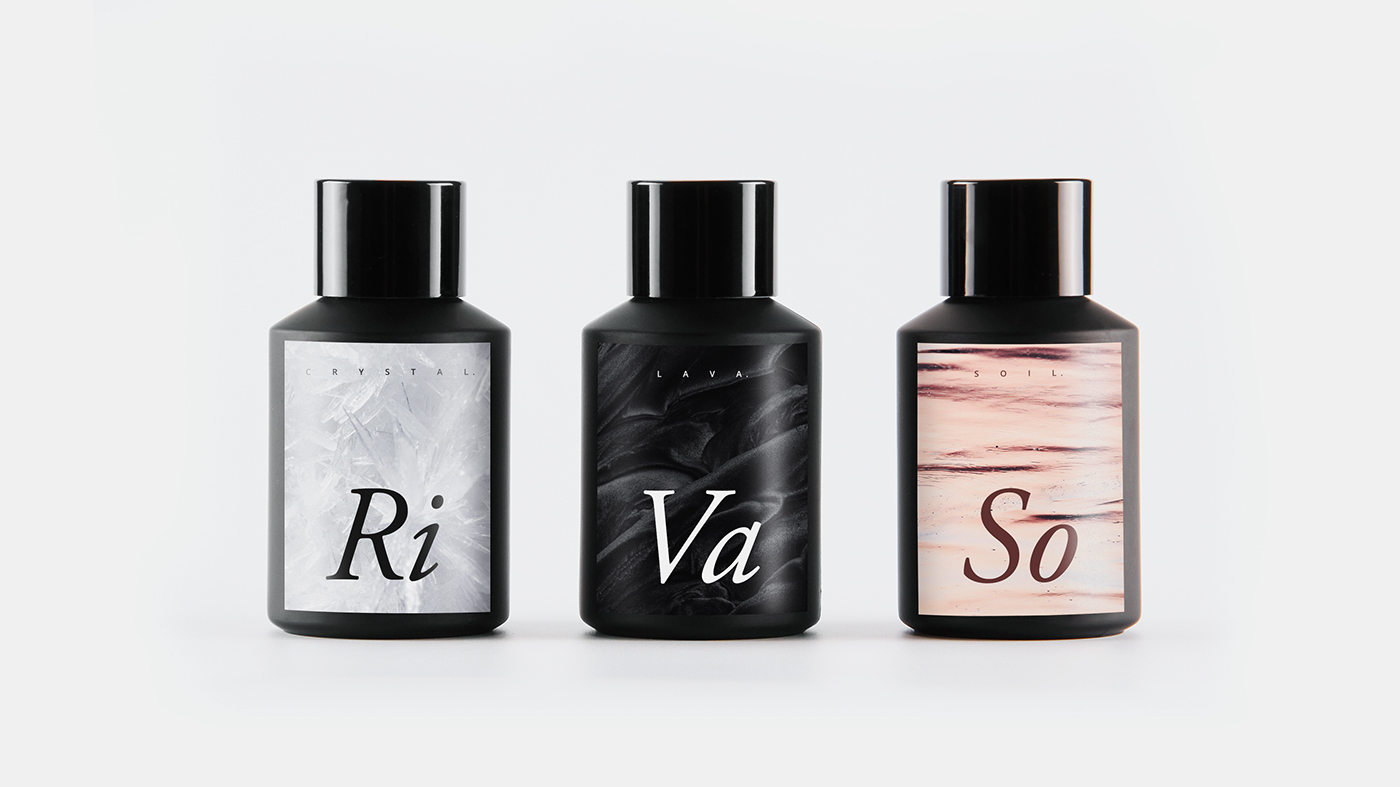 我們要為一款化妝品做包裝設計,標志設計從生活中看到最多的東西中獲得靈感——山脈。把最頂端的部分作為一個圖形化的隱喻,把它和一個現代的元素結合起來,我們的標志就是這樣形成的。為了進一步展示山岳的精神,我們從山中最常見的3個物體和中國傳統元素(金、木、水、火和土)中汲取靈感,形成了我們自己的3個包裝設計元素:熔巖、水晶、土壤。