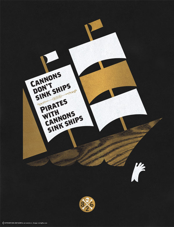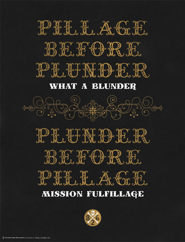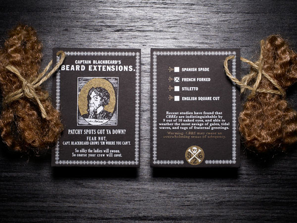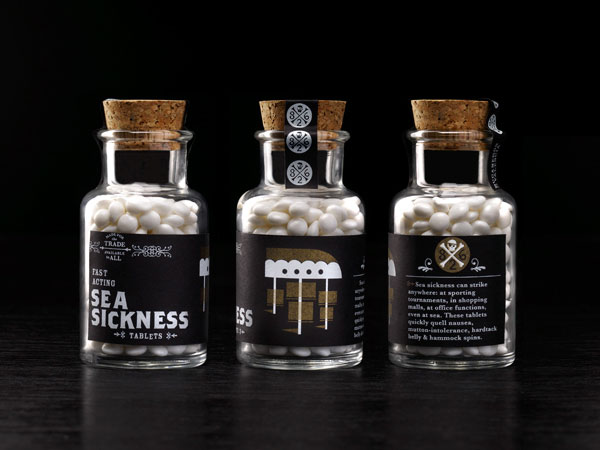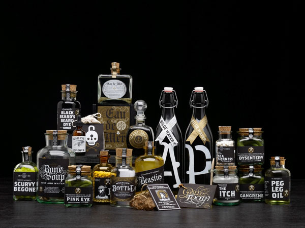 我們為這家店開發新的產品,里面賣的都東西是與海盜有關的、有趣的物品以及產品包裝。產品的包裝上采用酷酷的文字排版風格,并添加一些插畫做視覺元素,色彩上采用海盜經典的黑白色,襯托又酷又黑暗的氛圍,以金色為輔助色增添一種奢華感。