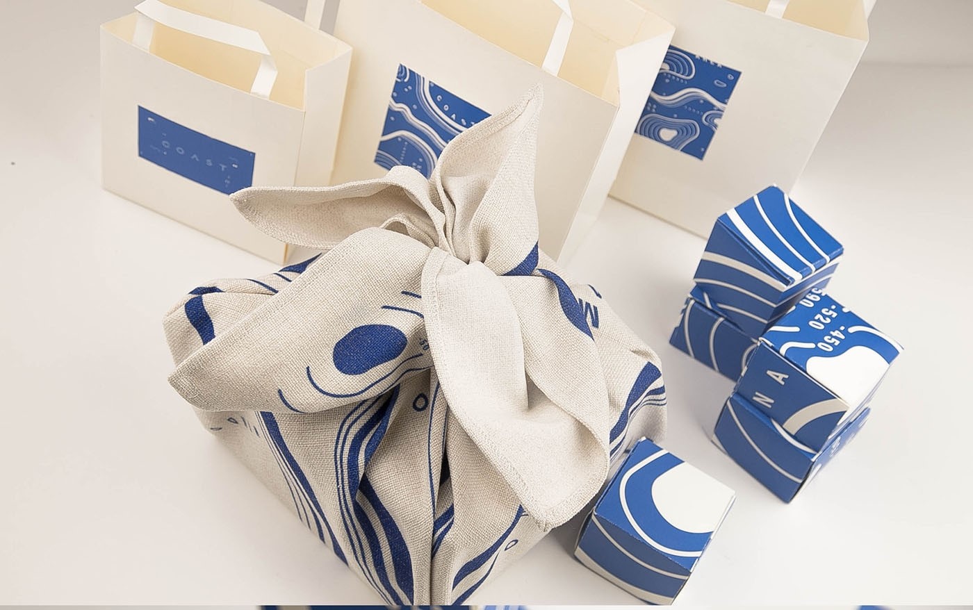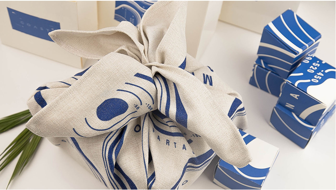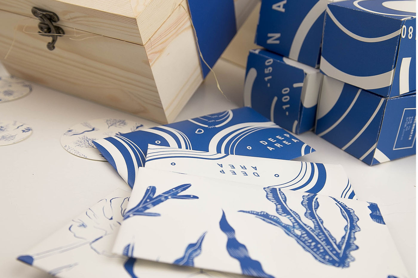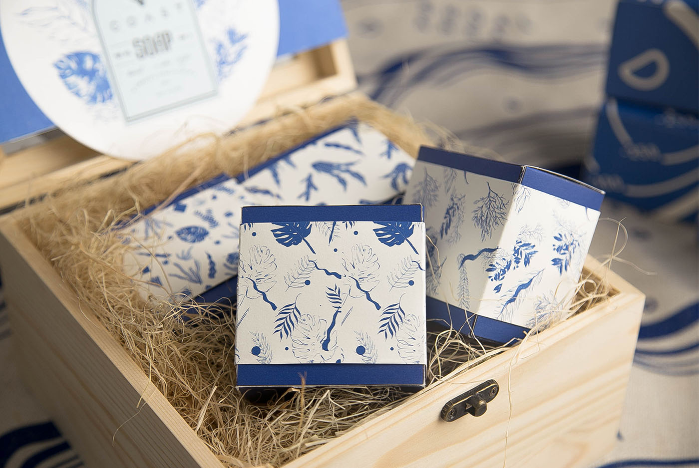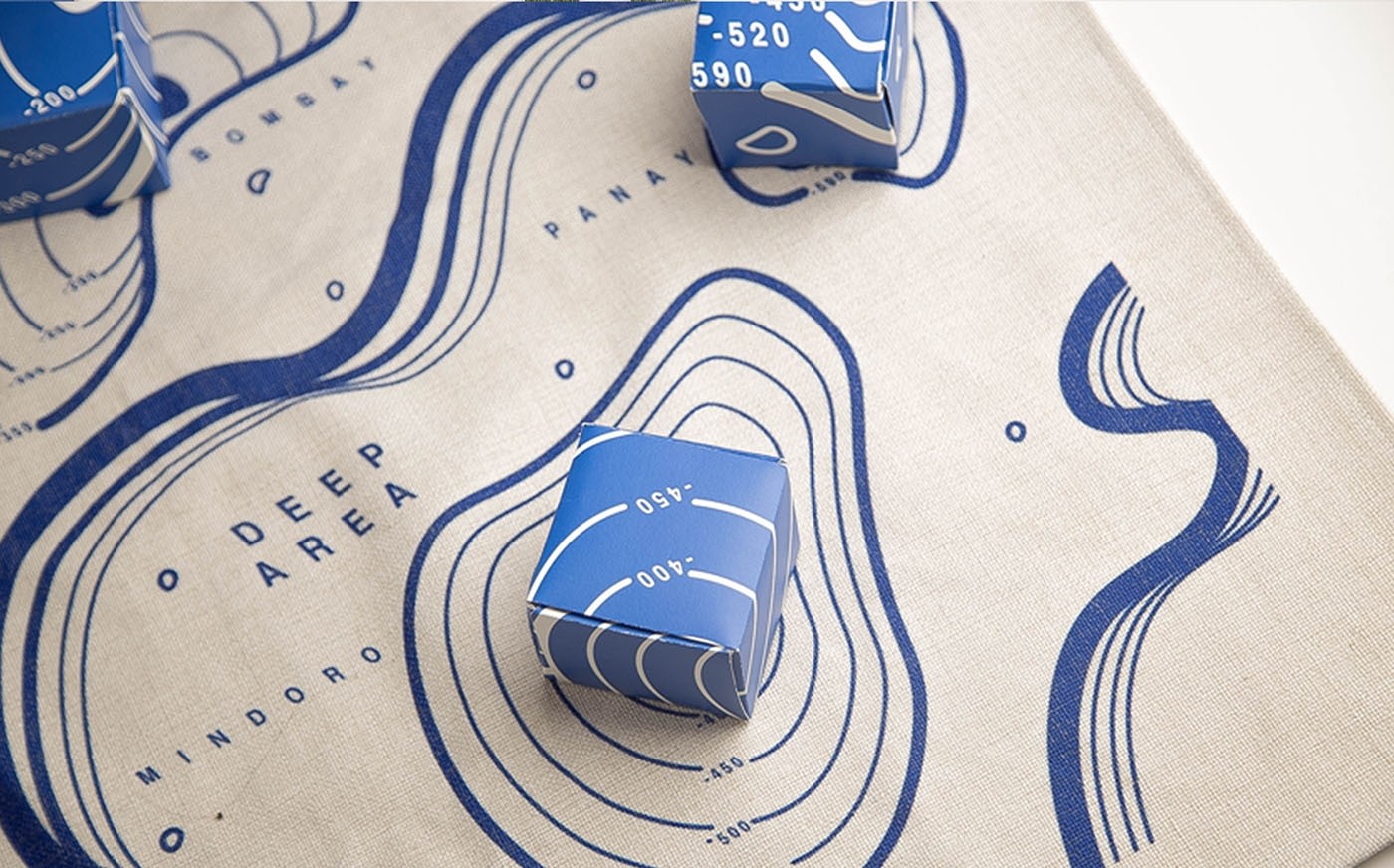 “COAST ”出發點起源于《黃渤海海藻》,發現藻類的功能與環境相對應,便想嘗試關于藻類的概念性包裝設計,小比例繪制南島海洋平面圖。兩條海岸線三個海區五類海島,環境溫度各不相同,分別產紅、綠、褐藻等有機藻類。不同深度的海灣海峽分布的藻類不同,我們提取了以紅藻、綠藻、褐藻為主的海藻進行針對性研究,發現在淺水區,大約平均-150米產綠藻,在中水區的海灣平均-350產紅藻,在深水區平均-550米地區產褐藻,功能均不相同,例如褐藻美白淡皺紋,紅藻消炎,綠藻美白。