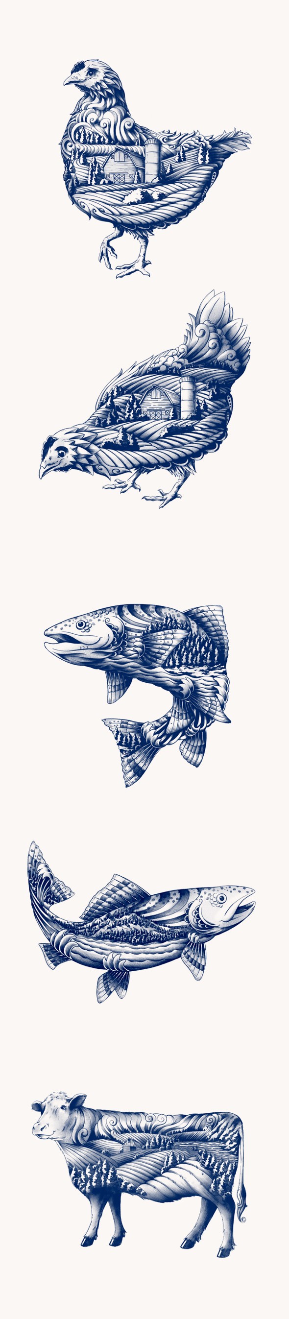 我們為他們開發了的品牌平臺以及視覺系統和包裝設計。在包裝設計過程中,我們與洛杉磯的插畫家本·郭先生合作,為牛、雞和魚設計插圖,并將其應用到包裝藝術中,插畫不僅表現了肉類品種,而且表現了動物養殖的環境,為產品包裝增加了趣味性。白藍的色彩搭配表現了產品干凈生態的特征,也讓消費者更加理智地做出選擇。