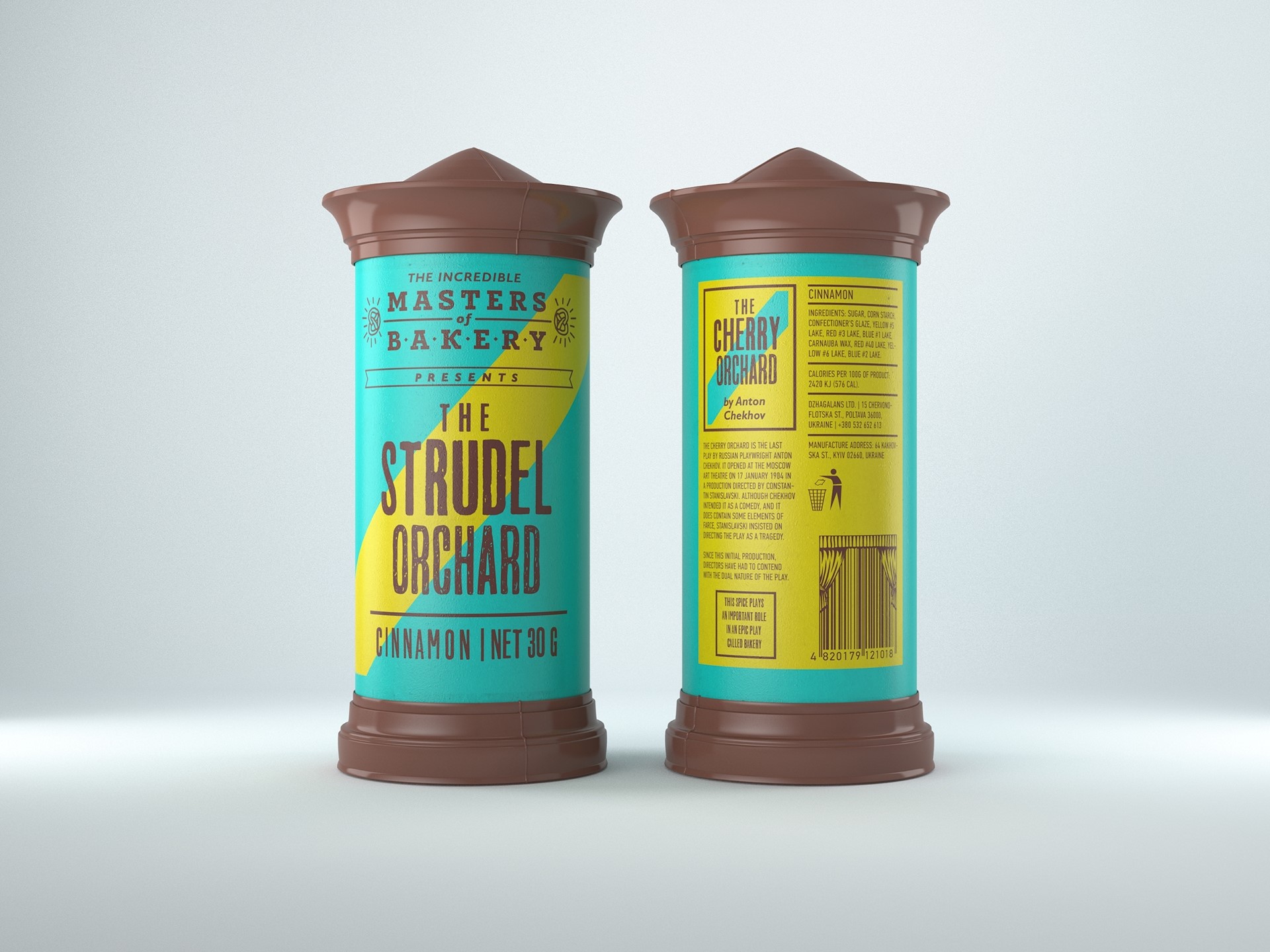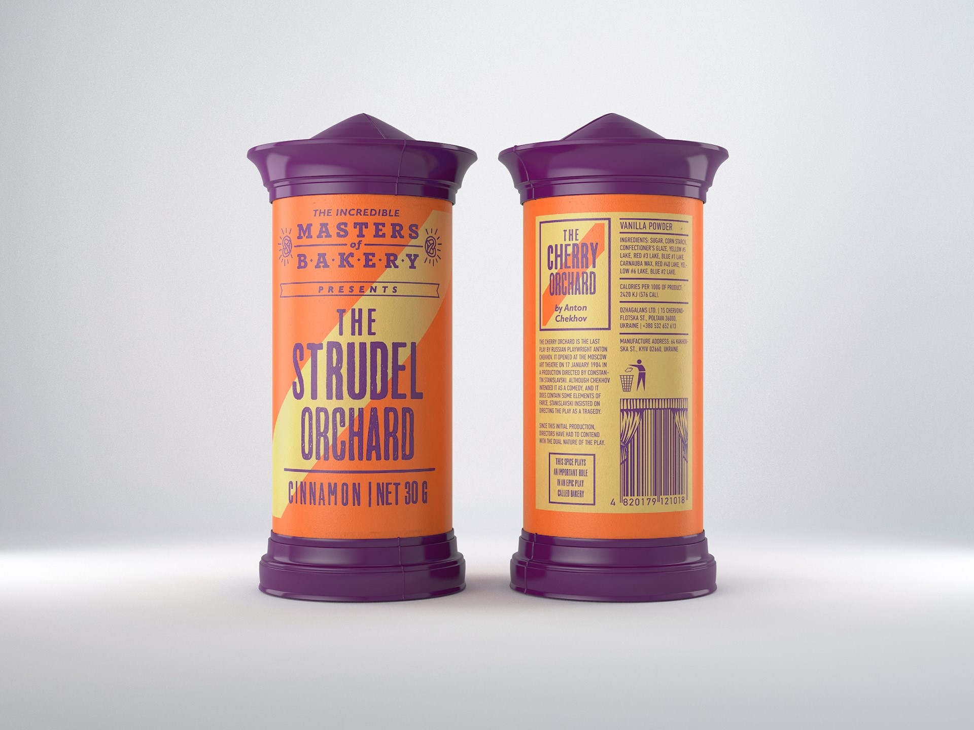 這個包裹的形狀就像有海報的戲劇柜。烏克蘭的烘焙香料受到劇院的啟發,食品香料包裝設計和標題都引用了廣告作品的播放器和劇本的名稱。這些香料容器的形狀類似于19世紀和20世紀初的大型圓柱形海報。除了形狀上的特別,包裝設計上還采用了文字的排版和艷麗的色彩,為八種不同的香料做系列包裝以及區分,整體包裝既充滿復古氣息又有現代感。