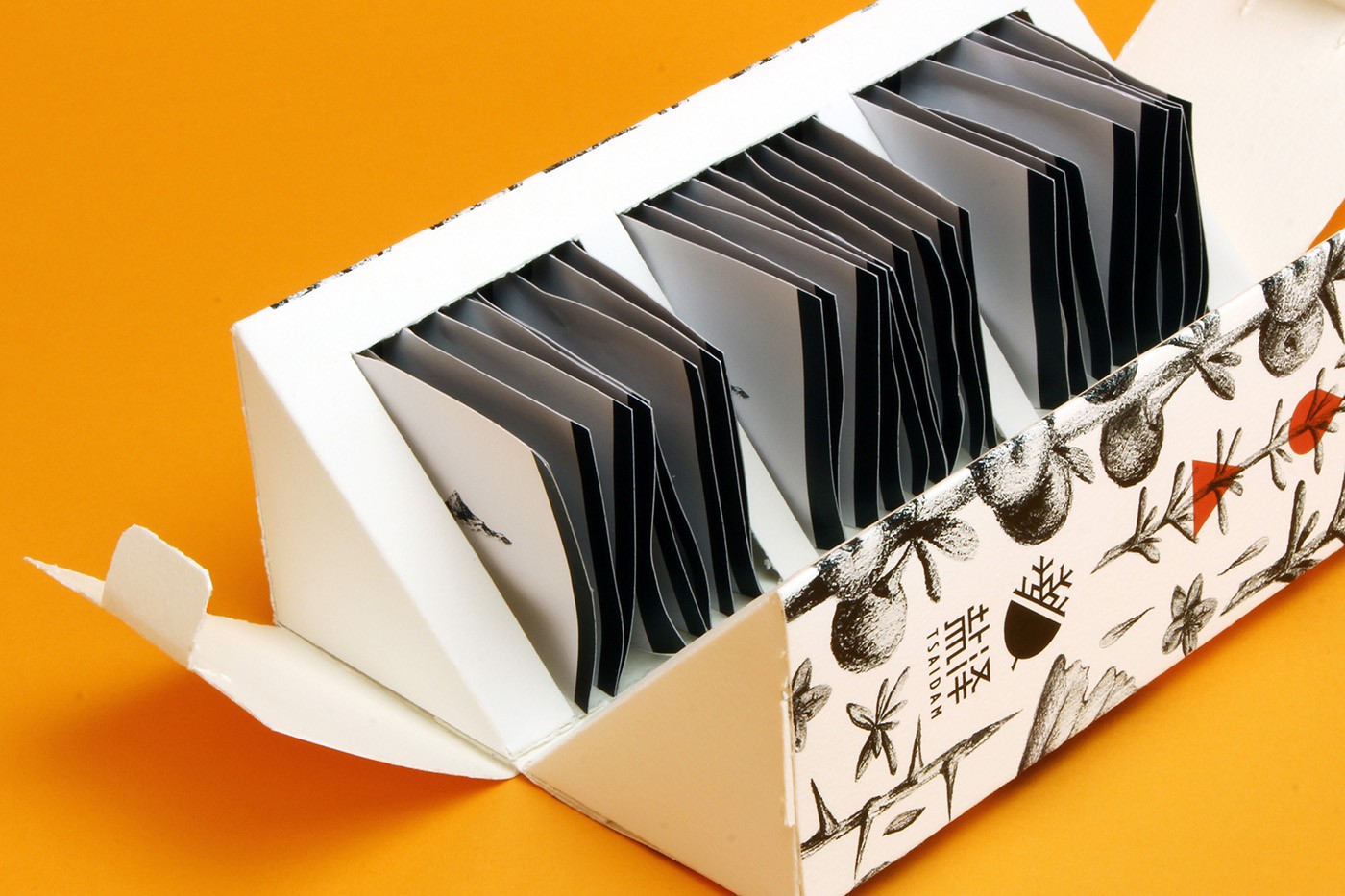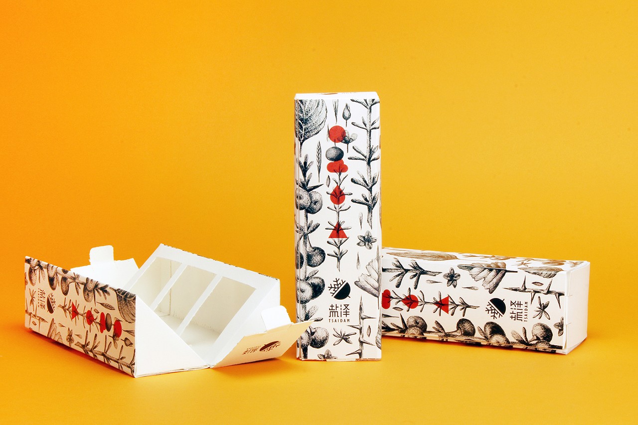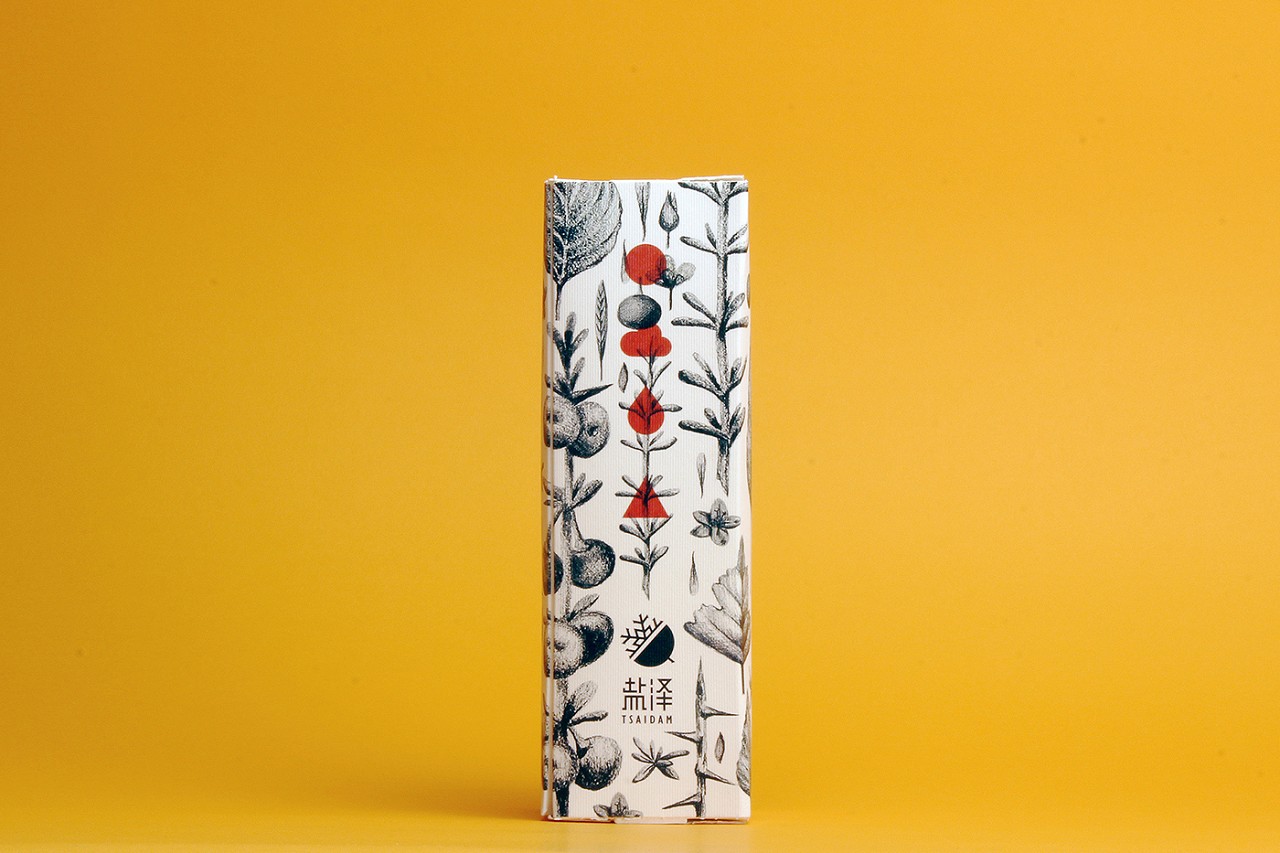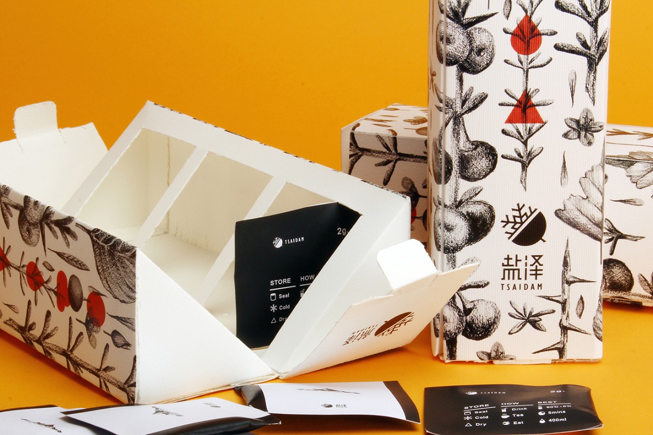 因為很多消費者不知道什么是黑枸杞,所以用創意茶葉包裝的方式畫出黑枸杞的各個時期,以黑枸杞為主要視覺元素。為了給消費者傳達產品的純天然和自然健康無添加,黑枸杞茶葉包裝設計上選用了黑白插畫的方式,少許的紅色代表黑枸杞的營養給人帶來的活力和好氣色。產品的包裝盒也經過精心的創作,是由兩個連接的三角體組成的長方體,打開后方便拿取。