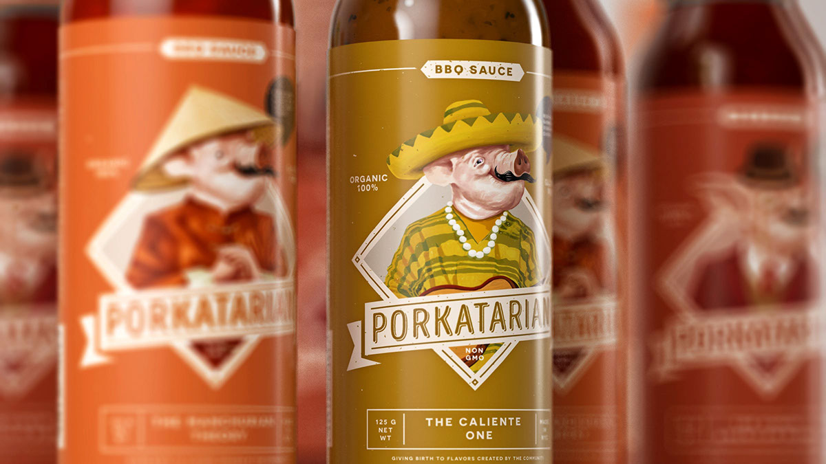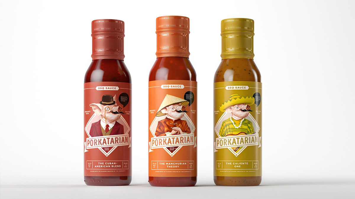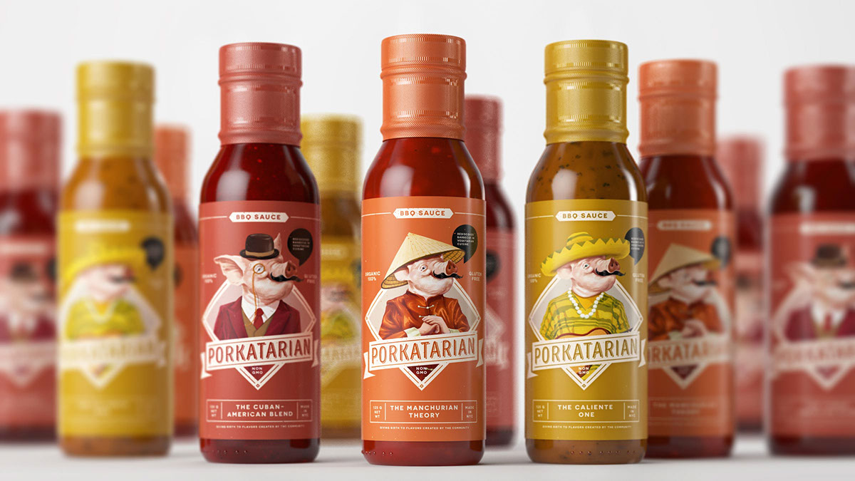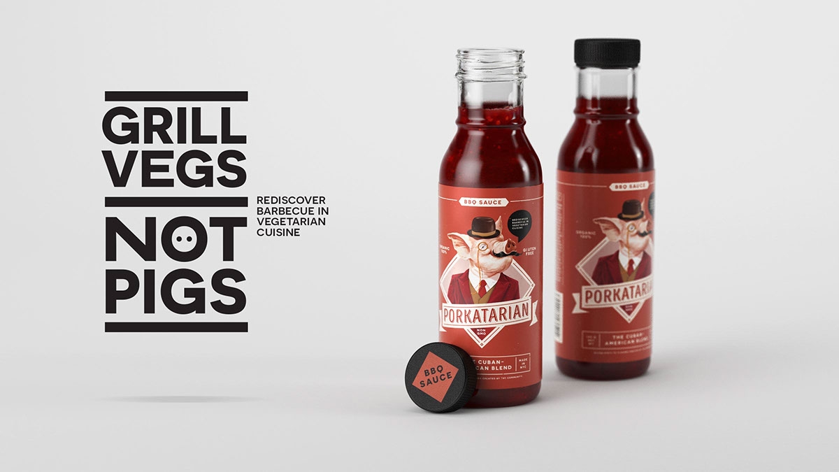 豬肉素食燒烤醬是專為那些喜歡燒烤但又不吃豬肉的人,總共有三種混合口味,用粗口瓶包裝,方便倒取。這次的產品包裝設計上主要采用插畫的表現手法為三種產品做系列包裝設計,包裝色彩上使用紅、橙、黃三種暖色調,目的是與燒烤時的火熱氣氛相呼應。插畫是三只穿著不同服裝的豬先生,每一種服裝和包裝的顏色都是對產品口味的可視化。 仔細觀察,你會從這個產品包裝上收獲更多的小驚喜,比如,瓶子底部的條形碼和燒烤架的結合就是一個跟有趣的小創意,還有可愛的胸章贈送。