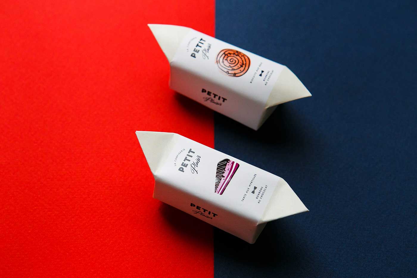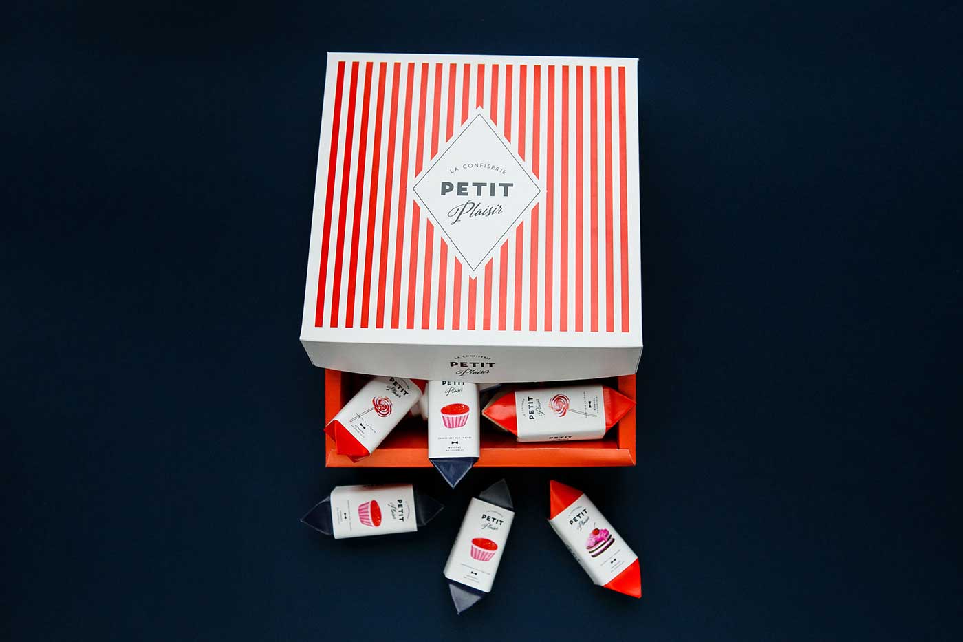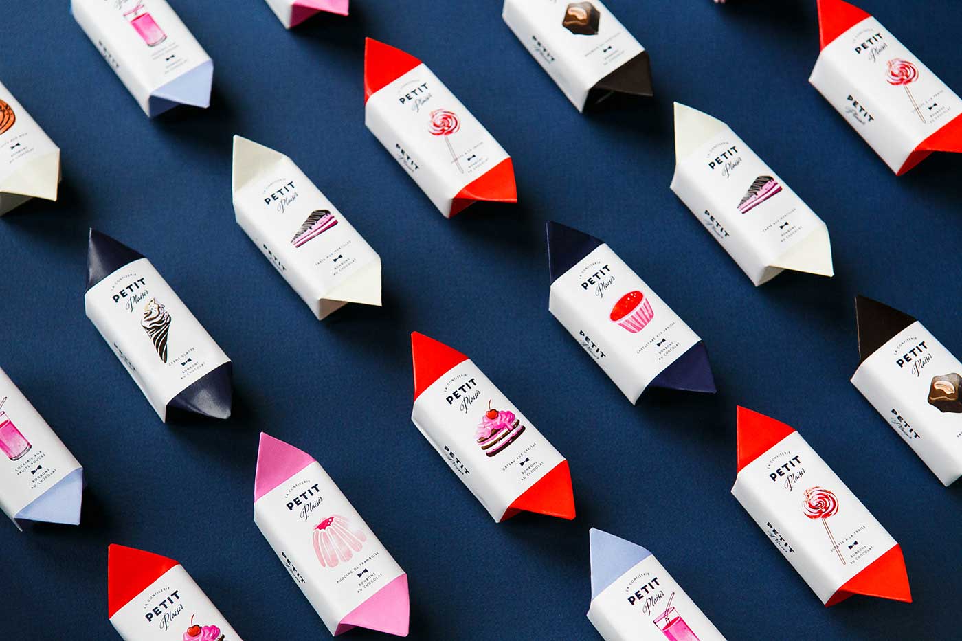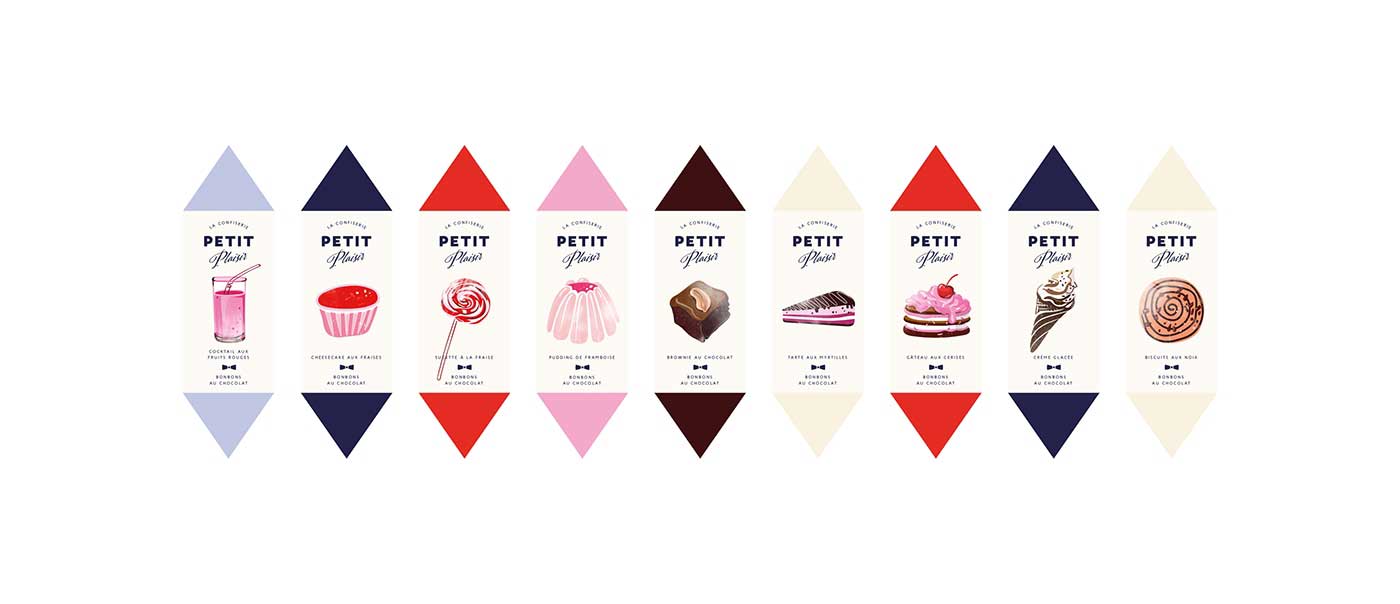 市場上的巧克力品牌數量越來越多,就連較為獨特的手工巧克力也變得不再特別,能否成為特別中的特別將決定一個品牌的命運。Petit Plaisir品牌想要突出,就必須從巧克力的口味到產品的視覺包裝設計都做足功夫。所以,他們創造了一系列的巧克力,包括九種不同口味,每一種口味都設計特定的產品包裝,以表達不同的口味。巧克力底部是天然的果凍,上面是法國漿果棉花糖(guimauve)和大理石紋的蛋糕(gateau),黑巧克力覆蓋外部所有區域。