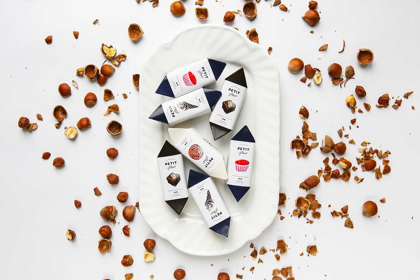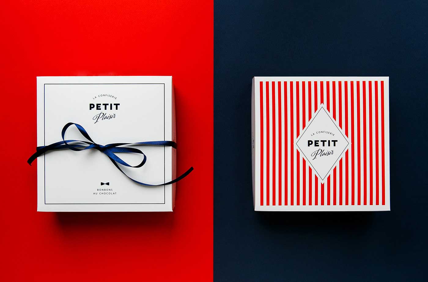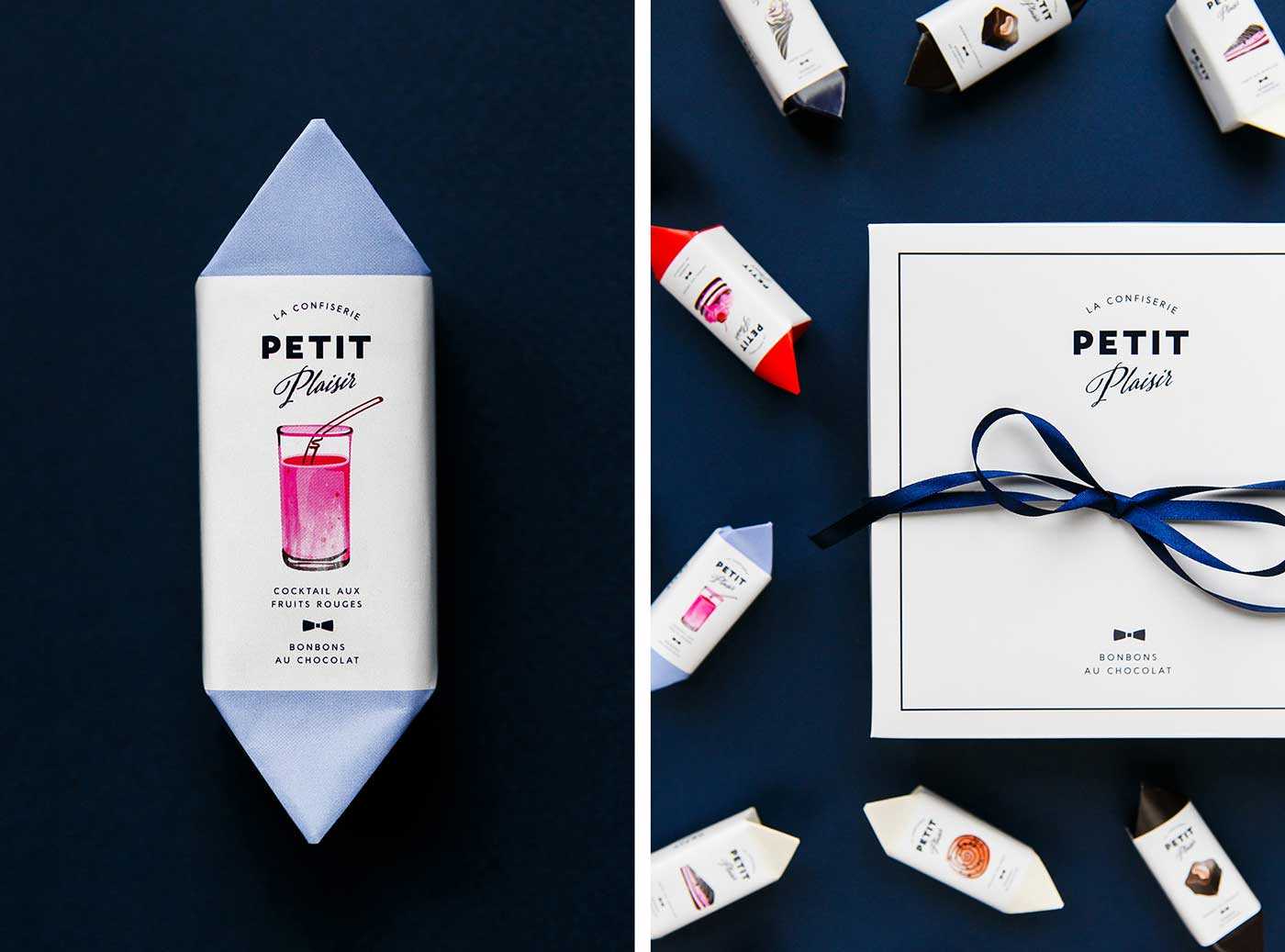 市場上的巧克力品牌數量越來越多,就連較為獨特的手工巧克力也變得不再特別,能否成為特別中的特別將決定一個品牌的命運。Petit Plaisir品牌想要突出,就必須從巧克力的口味到產品的視覺包裝設計都做足功夫。所以,他們創造了一系列的巧克力,包括九種不同口味,每一種口味都設計特定的產品包裝,以表達不同的口味。巧克力底部是天然的果凍,上面是法國漿果棉花糖(guimauve)和大理石紋的蛋糕(gateau),黑巧克力覆蓋外部所有區域。