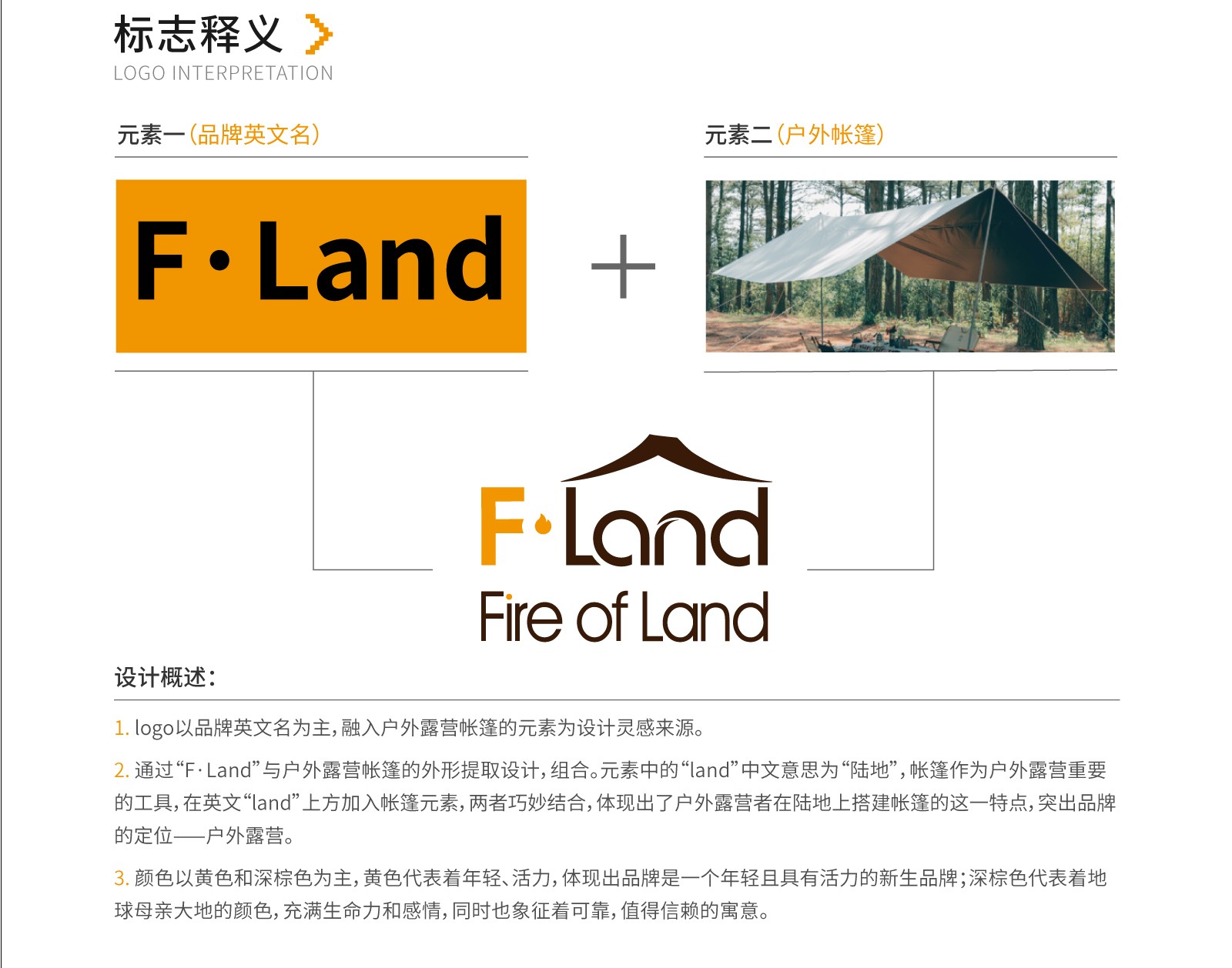 通過“F.Land"與戶外露營帳篷的外形提取設計,組合。元素中的“land"中文意思為“陸地”,帳篷作為戶外露營重要的工具,在英文“land"上方加入帳篷元素,兩者巧妙結合,體現出了戶外露營者在陸地上搭建帳篷的這一特點,突出品牌的定位一戶外露營。