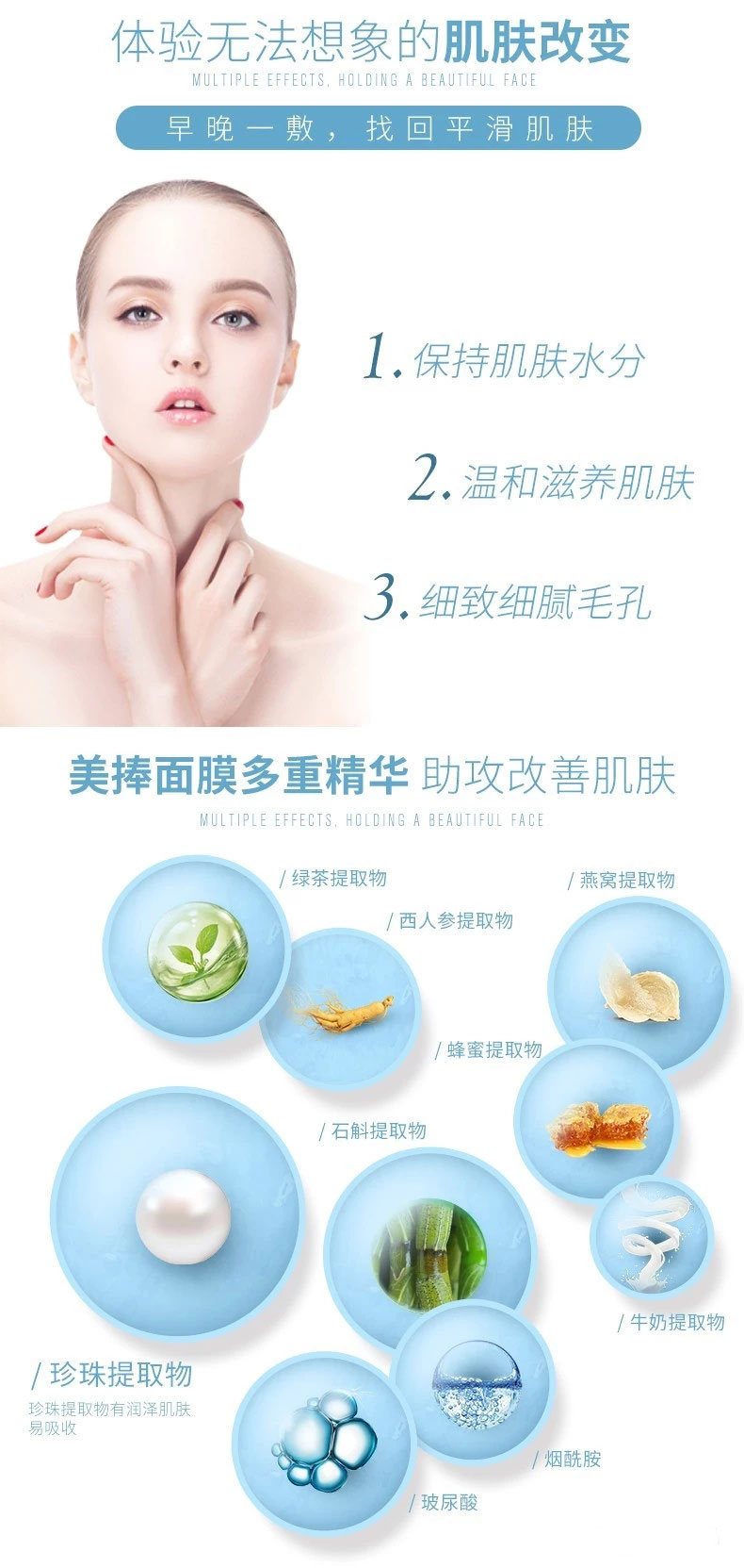 產品說明: 蘊含透明質酸、珍珠提取物、酵母發酵產物提取物,補充肌膚水分,滋潤保濕,溫和滋養,細致毛孔, 舒緩修護,長期使用令肌膚更加細致光滑。