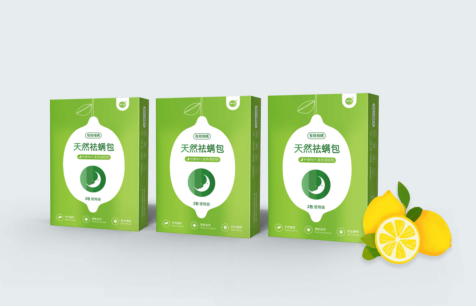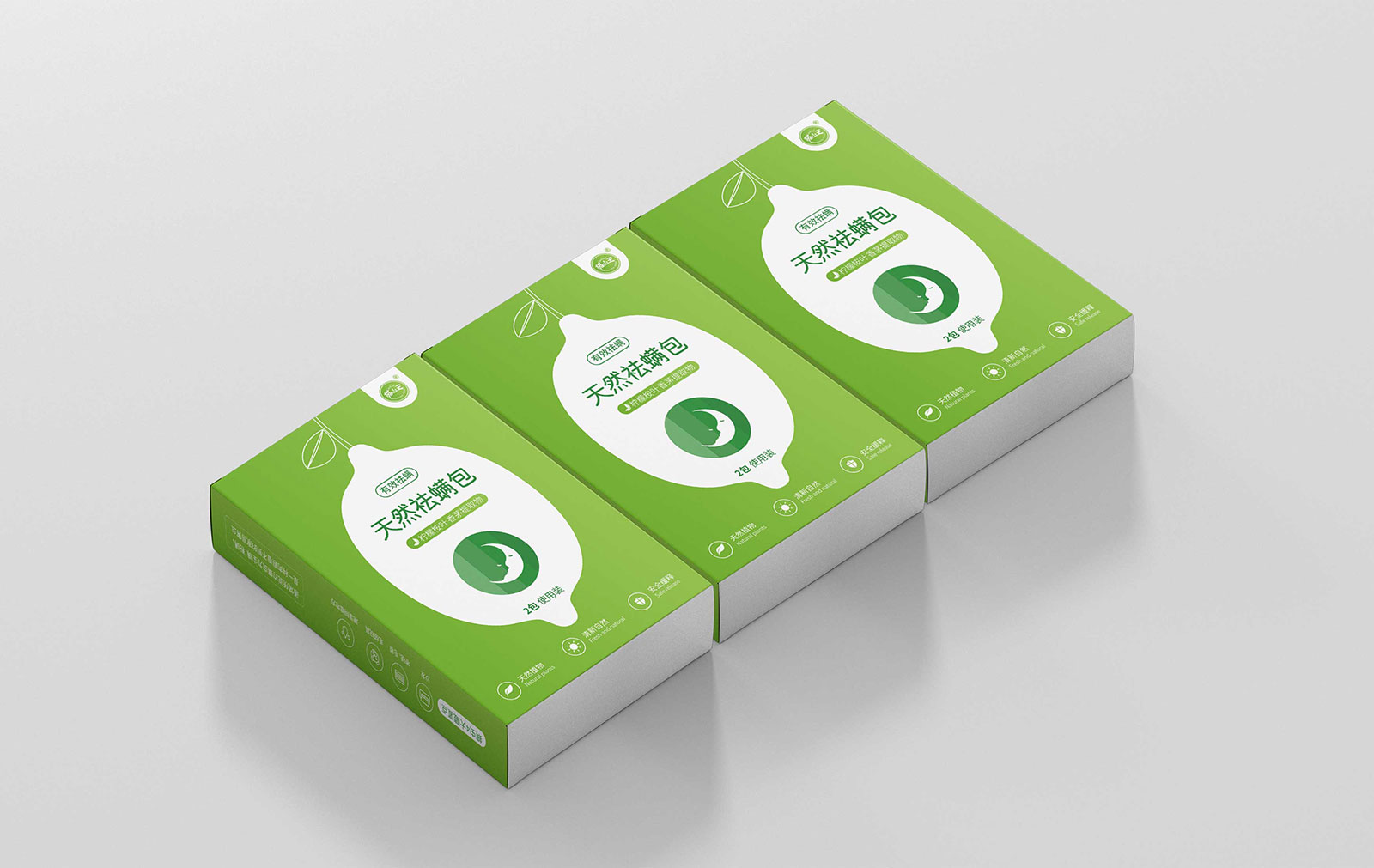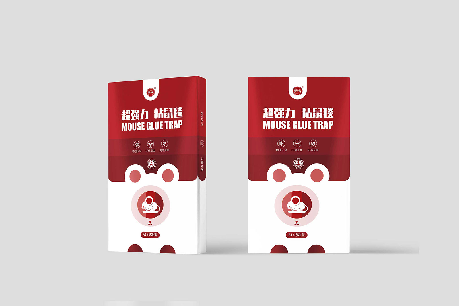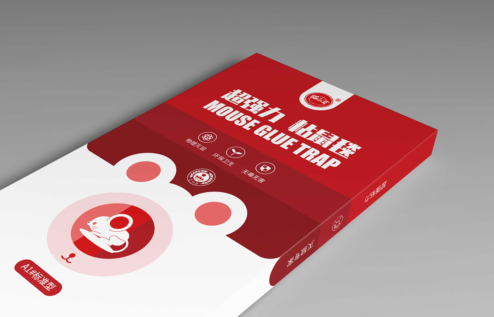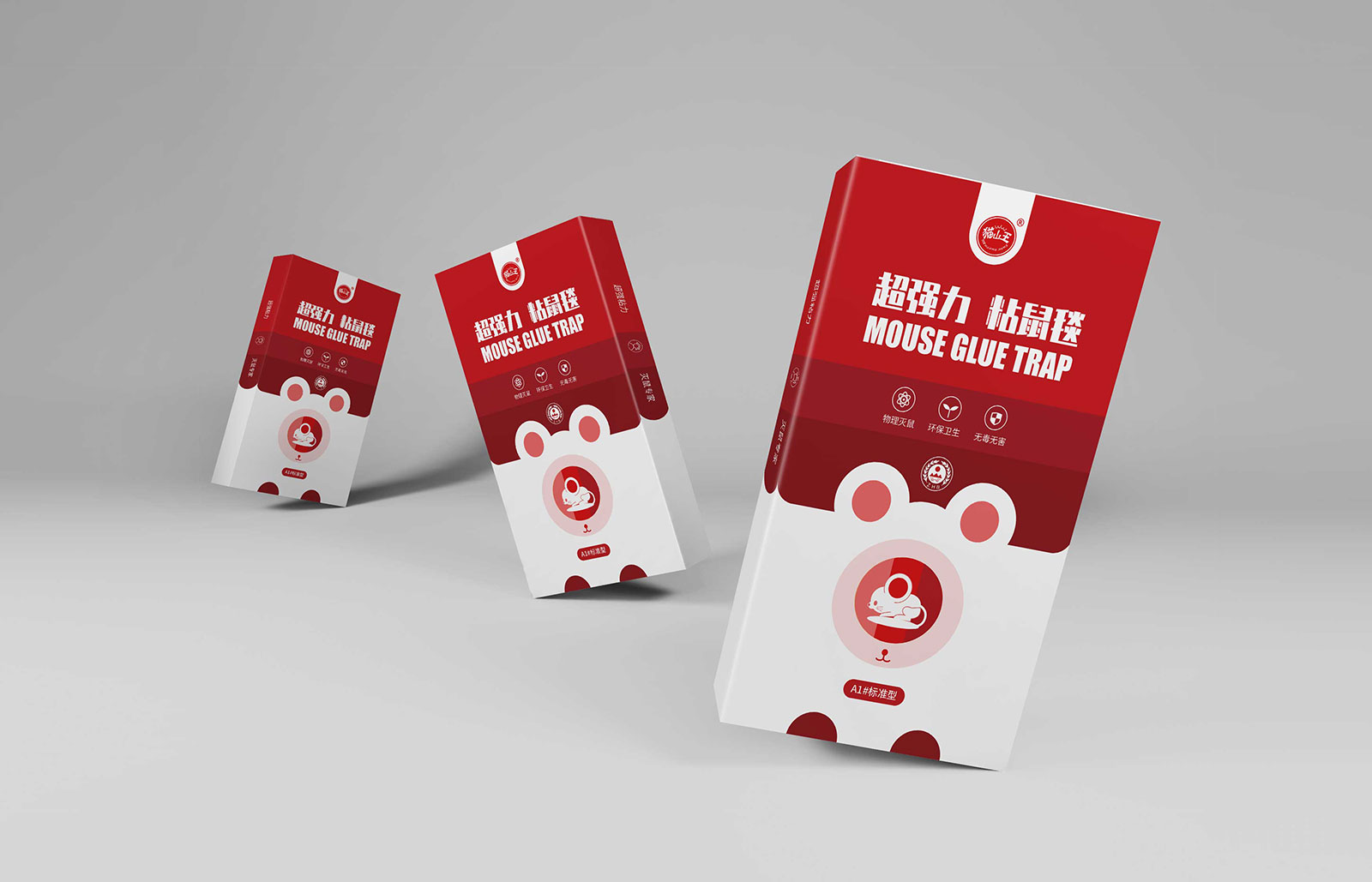 其一天然祛螨包主打天然植物、清新自然、安全緩釋的產品特點,其中天然植物中主要含有檸檬桉葉與香茅提取物,所以采用代表天然的綠色作為主色調,檸檬作為主要的設計元素呈現在包裝上,由于祛螨包的使用直接與人類睡眠相關,所以加入了月亮作為輔助元素,從包裝上就體現其產品成分、功能、特點。其二超強力粘鼠板主打物理滅鼠、環保衛生、無毒無害,采用簡約的包裝特征,抓住“超強力”這個購買理由,用紅色形象表達,結合老鼠的外在形象特征進行設計。通過包裝升級統一形象后,深化了貓山王在用戶心中的外在形象,品類包裝問題得以解決。