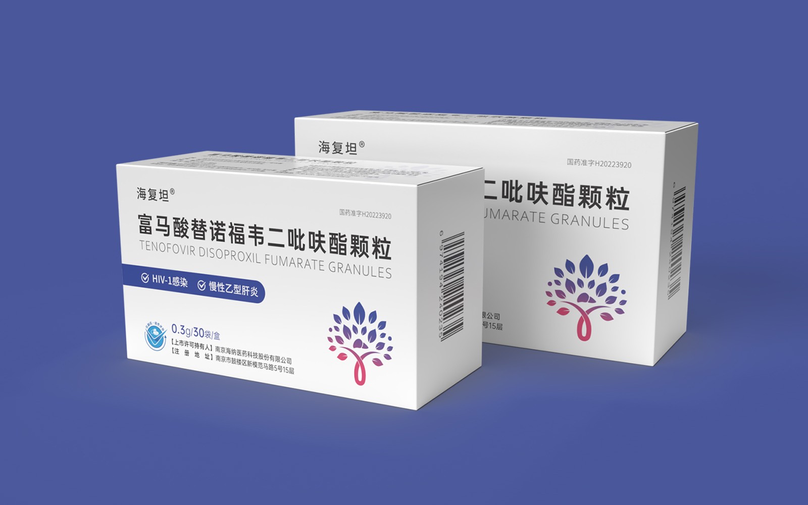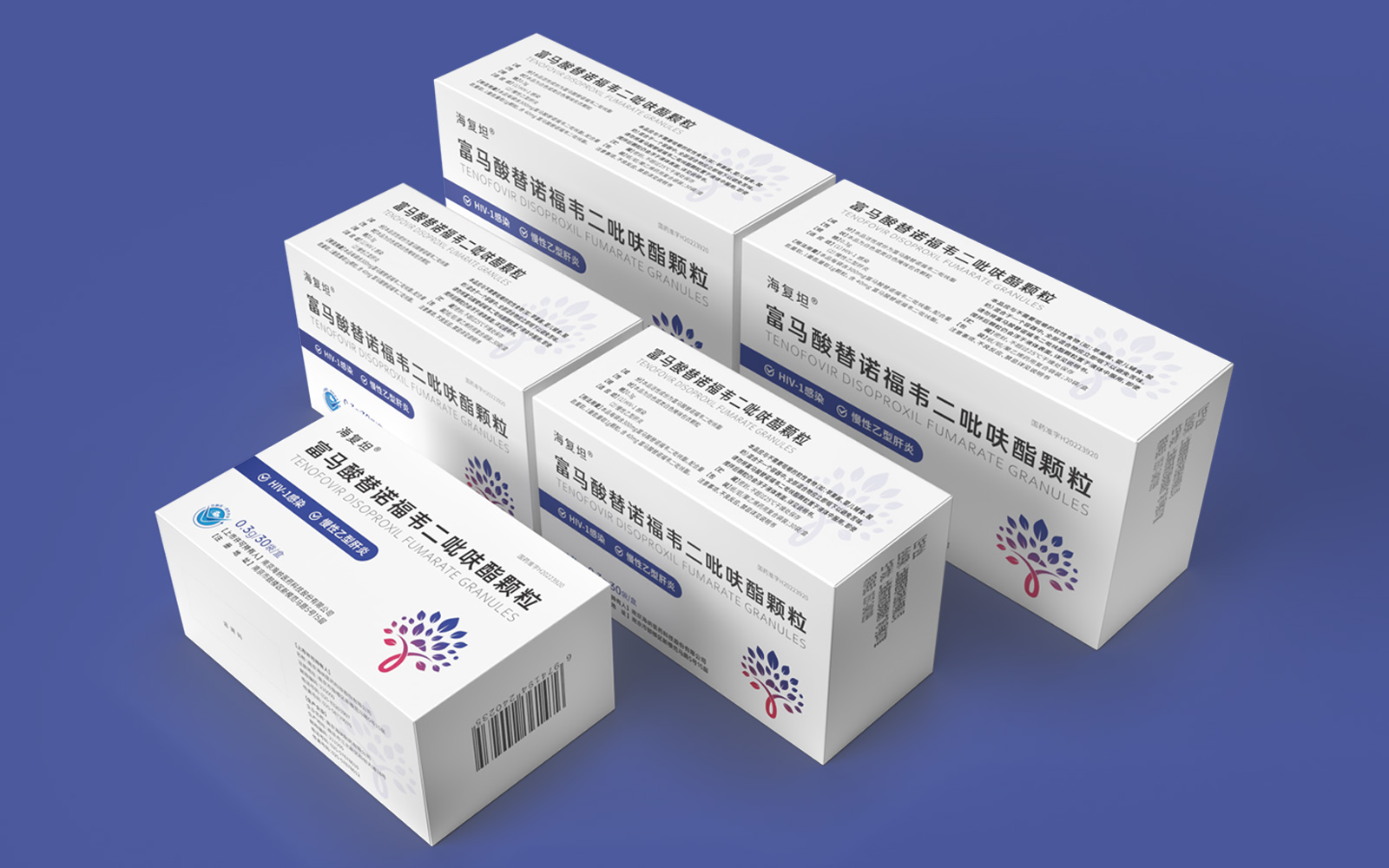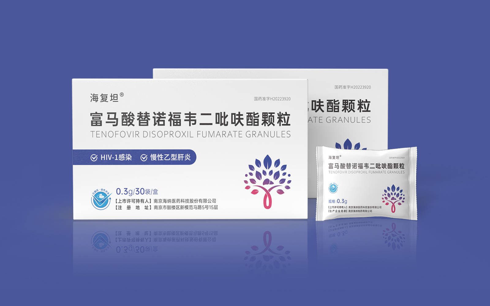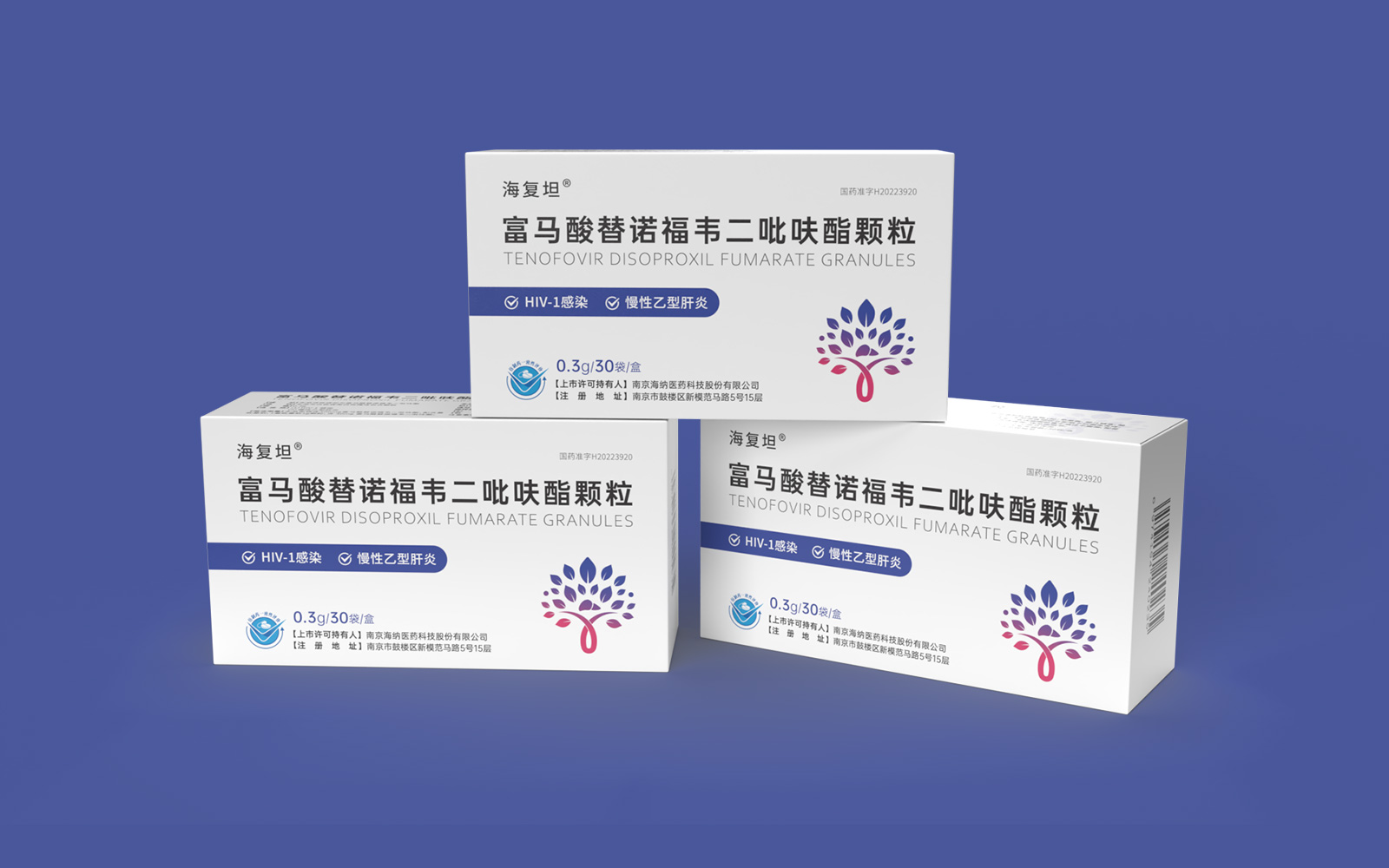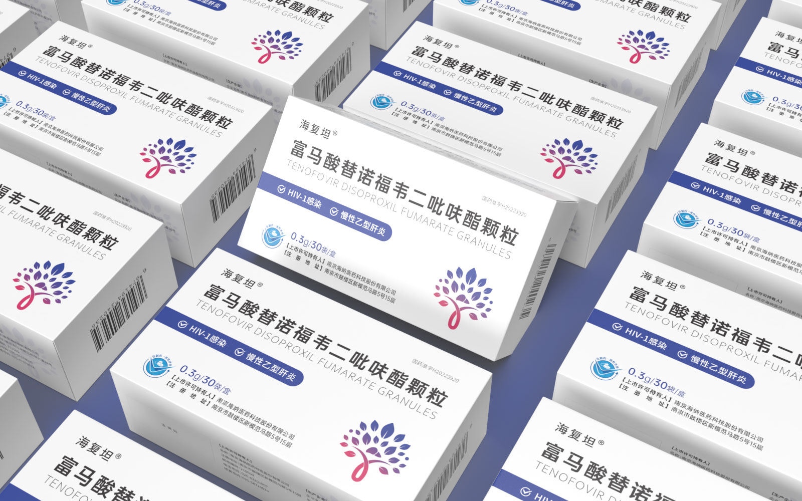 主視覺由HIV標識、肝、大樹、雙手結合設計呈大樹形主圖案。HIV》標識\肝臟標識突出產品適應癥,大樹/樹葉寓意健康、生命和安全,象征成長新生的希望之樹。雙手捧著代表呵護與關愛,象征著企業以人為本/以健康關愛為本。主視覺采用冷暖色漸變,藍色醫療屬性強烈,代表醫療健康、冷靜,粉紅色既有主治癥狀HIV標識及肝部的色彩表現同時也代表著疼痛深藍到粉紅的處理方式.表現一種正在緩解及治療病狀的過程。