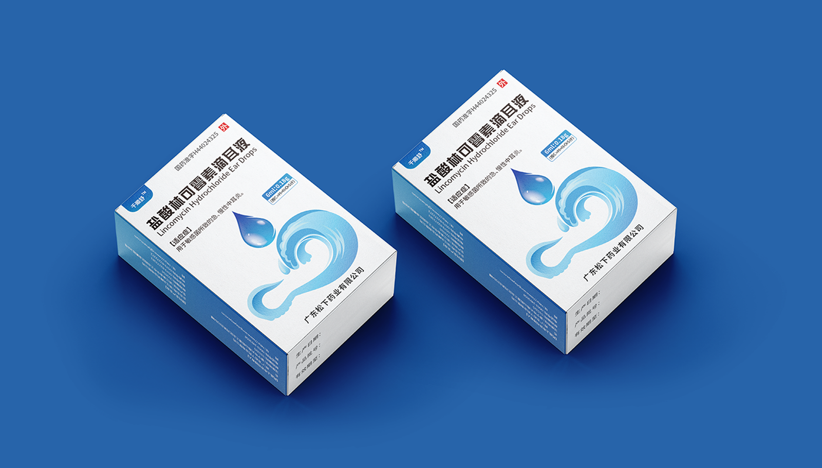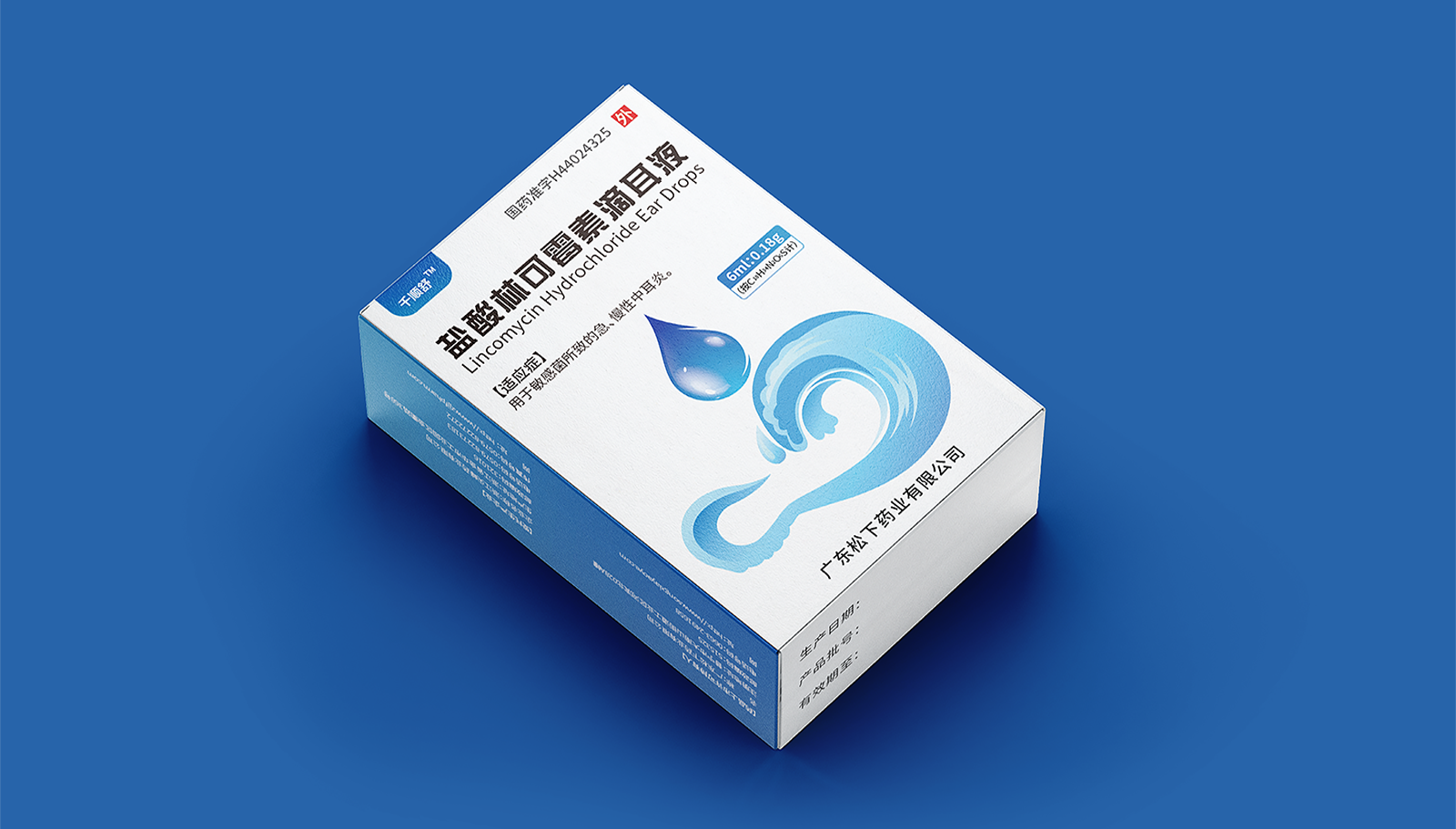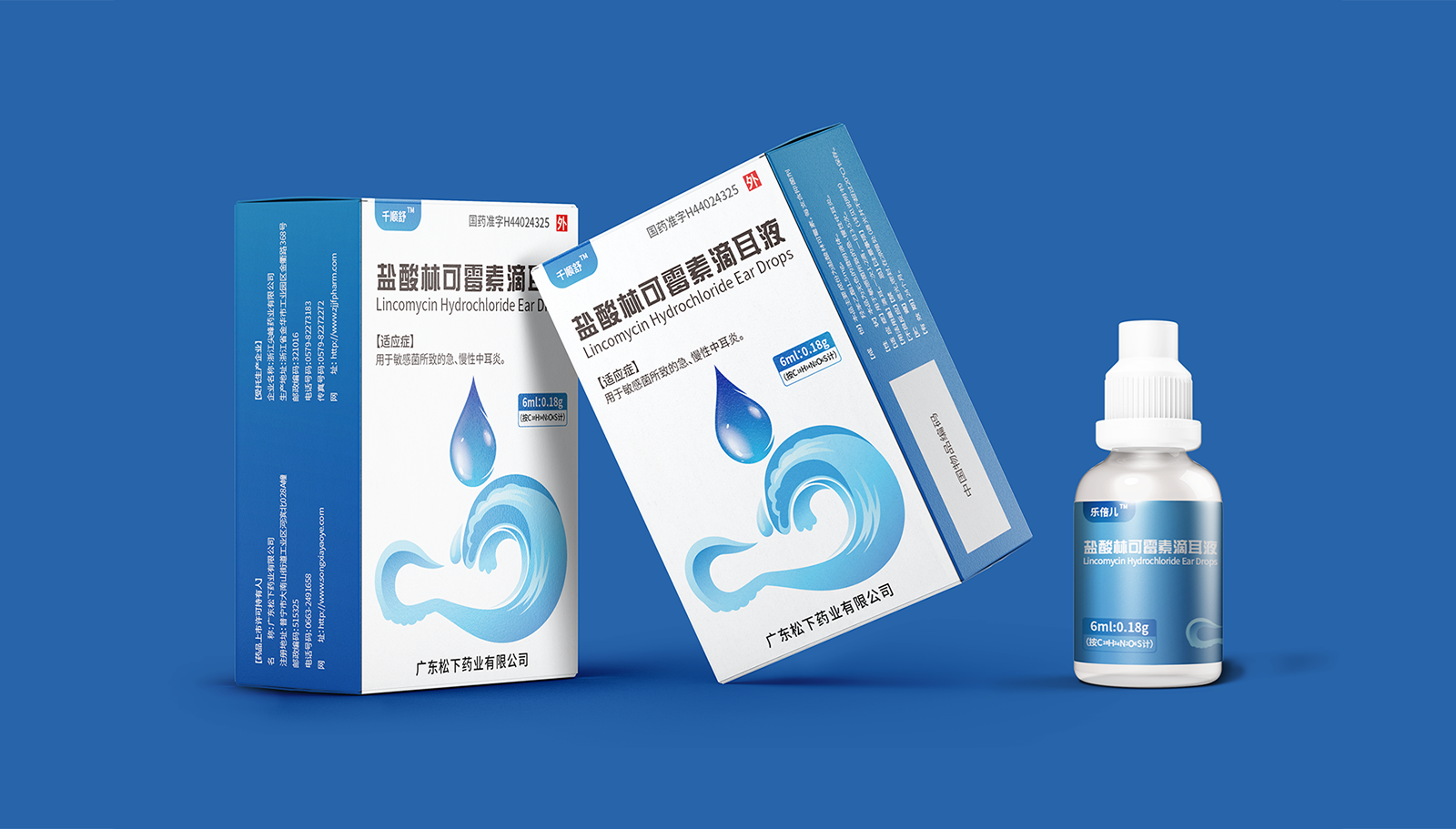 創意:包裝主畫面呈現的是用藥的畫面,水滴代表產品劑型并突出放大處理,下部分的耳廓外型與海浪結合,通過大海的意象,表達寧靜、舒適、清潔,象征著良好的用藥體驗。版式:在版式上,結構簡約、干凈、大氣的風格,規格、適應癥等核心信息突出顯示,字體清晰易辨,整體主次分明,重點突出。色彩:考慮到患者心理感受,色彩上以藍色為主色調,藍色代表鎮靜、潔凈與安全,一來加深企業穩定可靠的印象,二來對患者起到安撫的情緒和心里暗示。