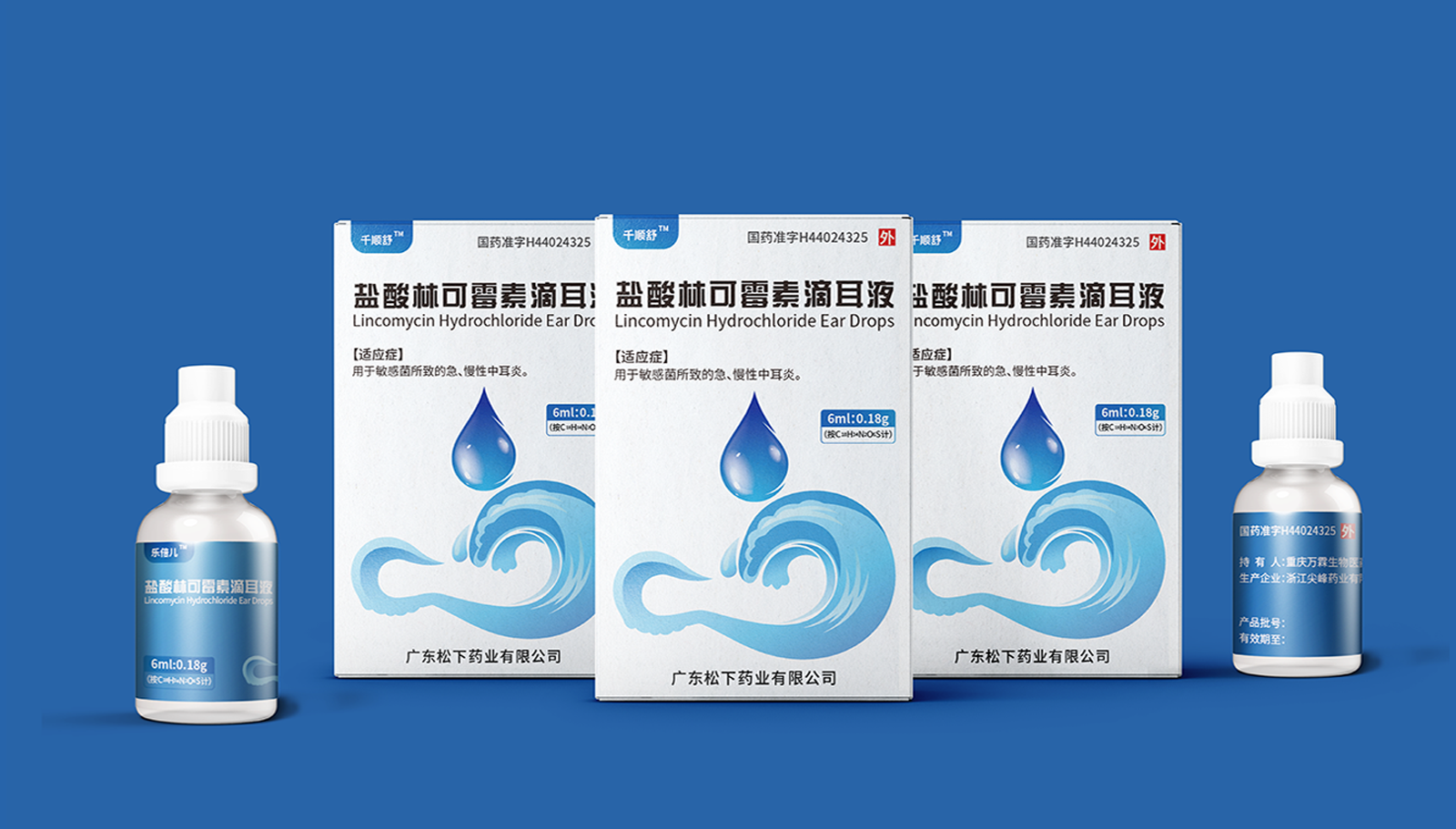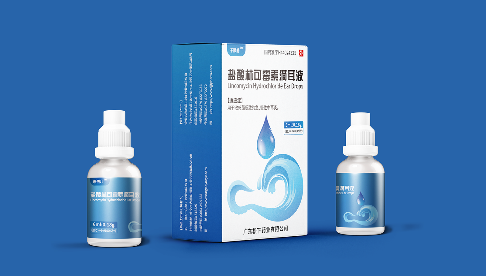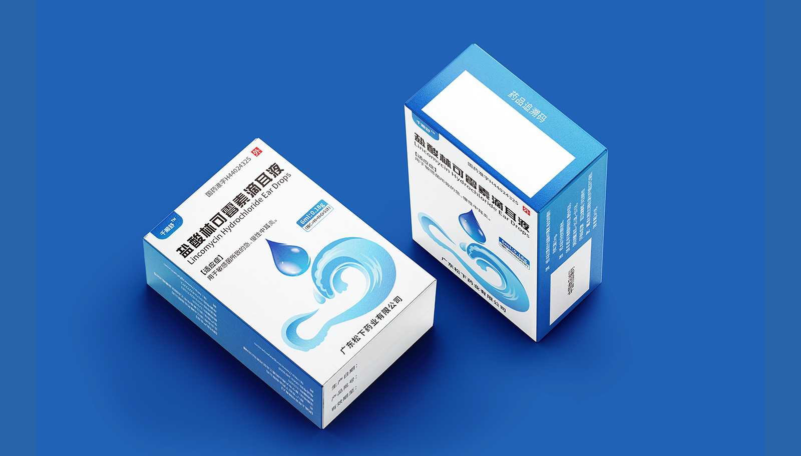 創意:包裝主畫面呈現的是用藥的畫面,水滴代表產品劑型并突出放大處理,下部分的耳廓外型與海浪結合,通過大海的意象,表達寧靜、舒適、清潔,象征著良好的用藥體驗。版式:在版式上,結構簡約、干凈、大氣的風格,規格、適應癥等核心信息突出顯示,字體清晰易辨,整體主次分明,重點突出。色彩:考慮到患者心理感受,色彩上以藍色為主色調,藍色代表鎮靜、潔凈與安全,一來加深企業穩定可靠的印象,二來對患者起到安撫的情緒和心里暗示。