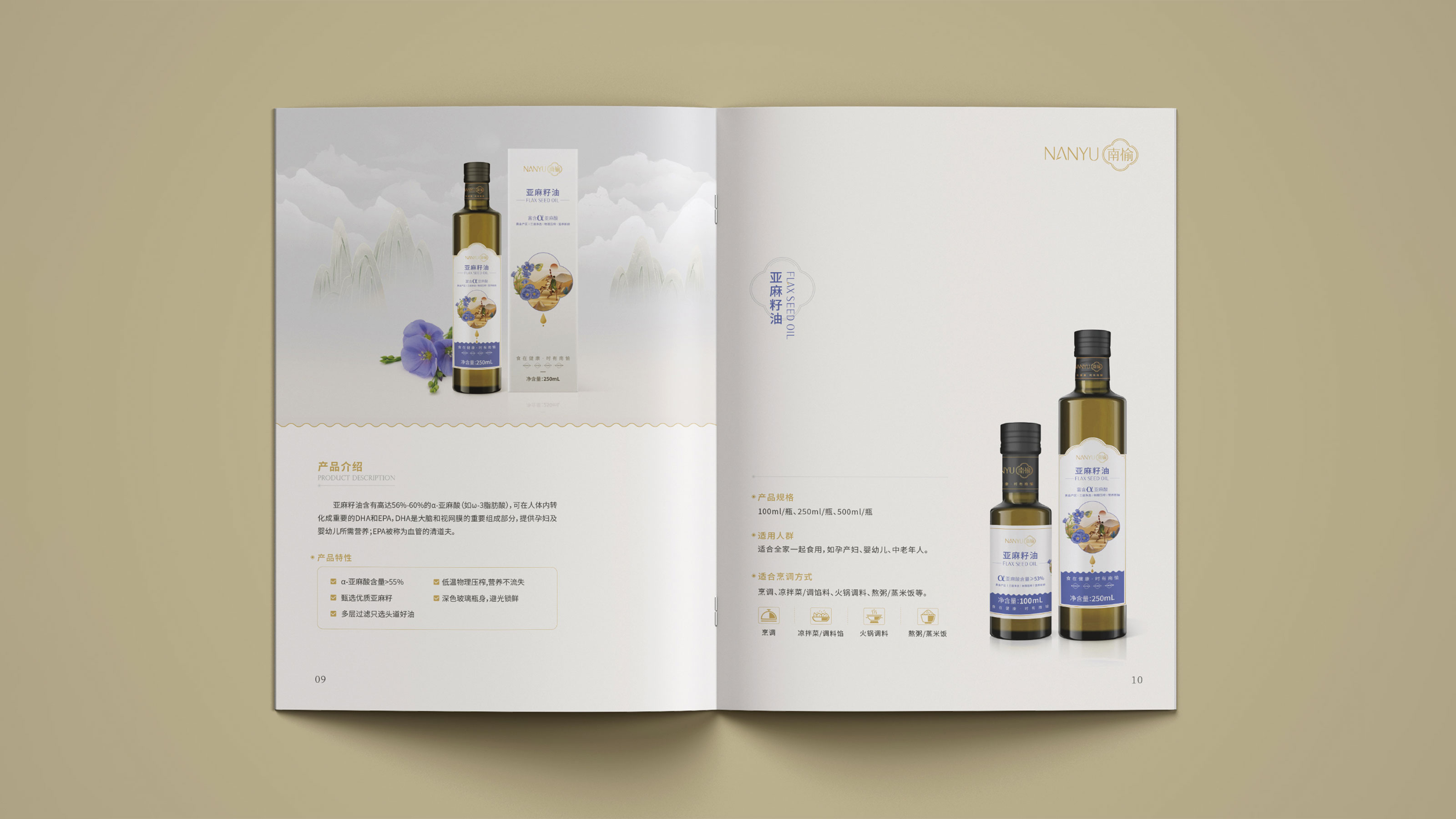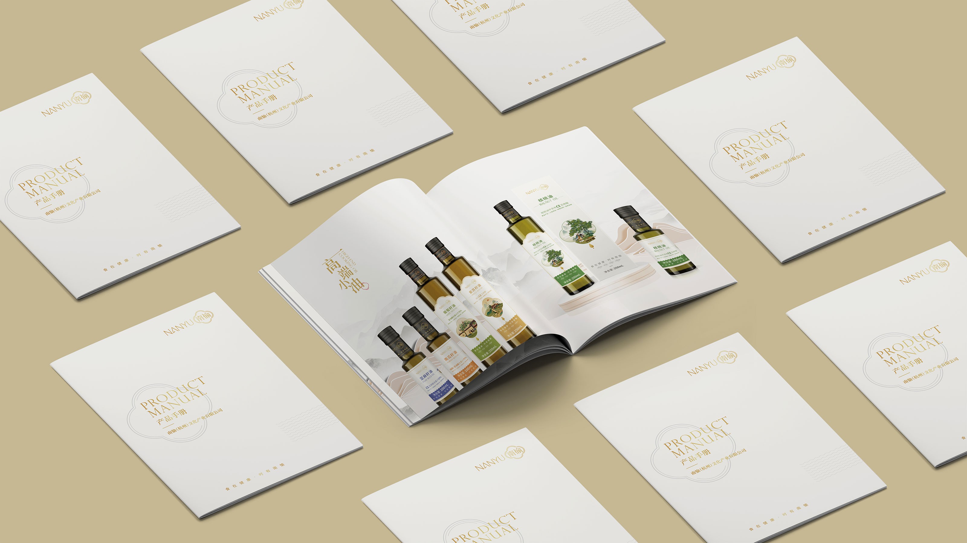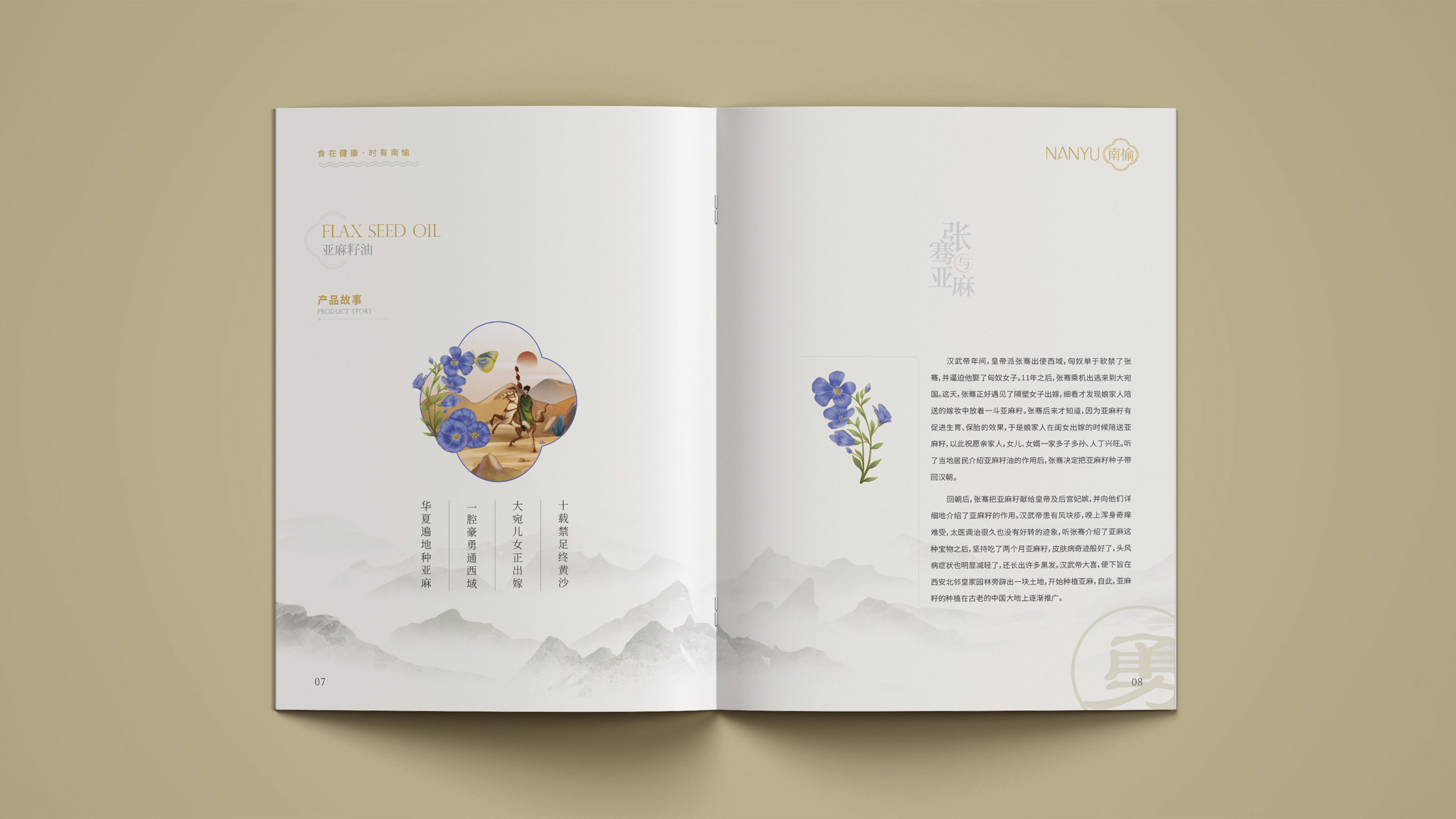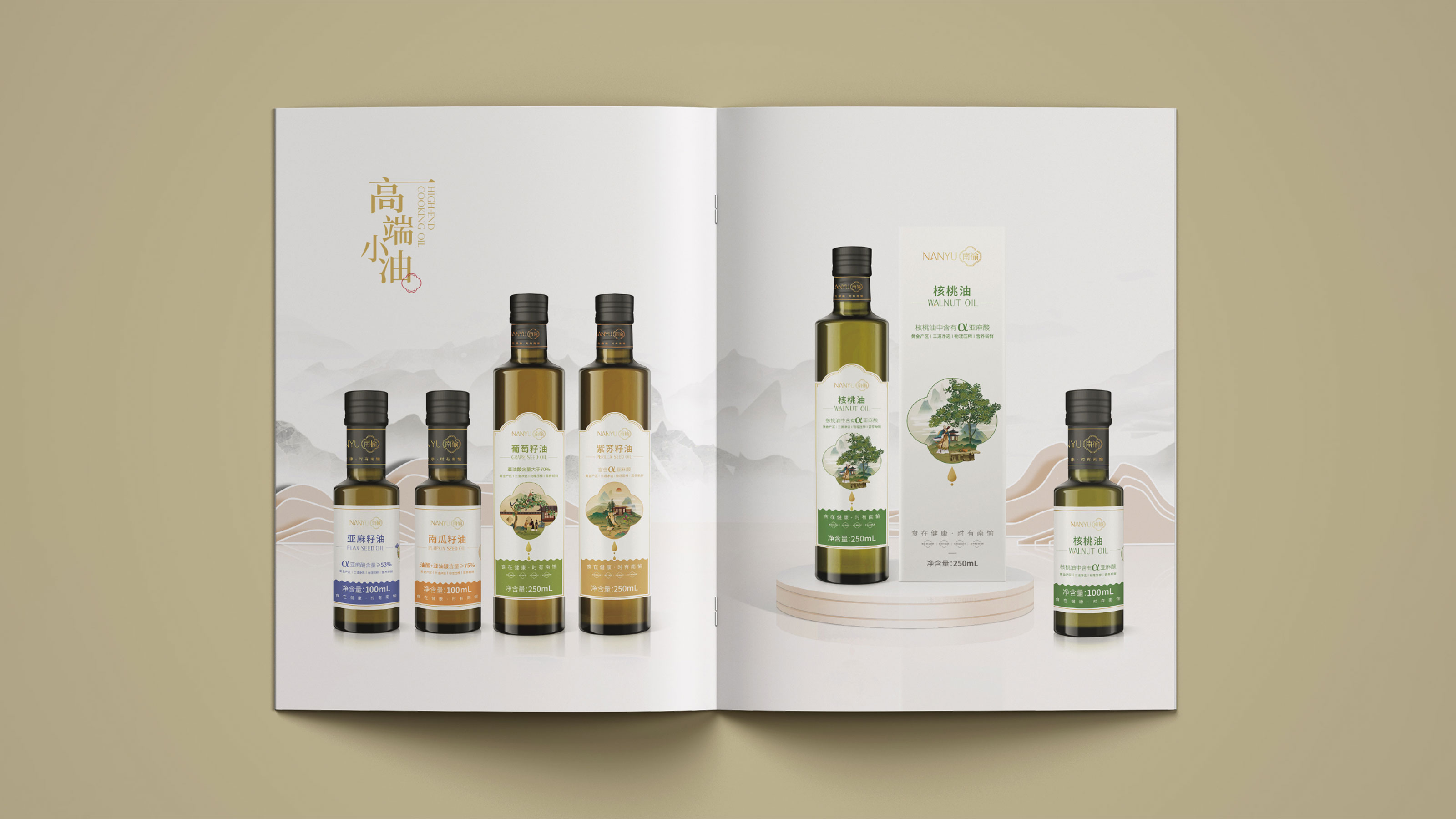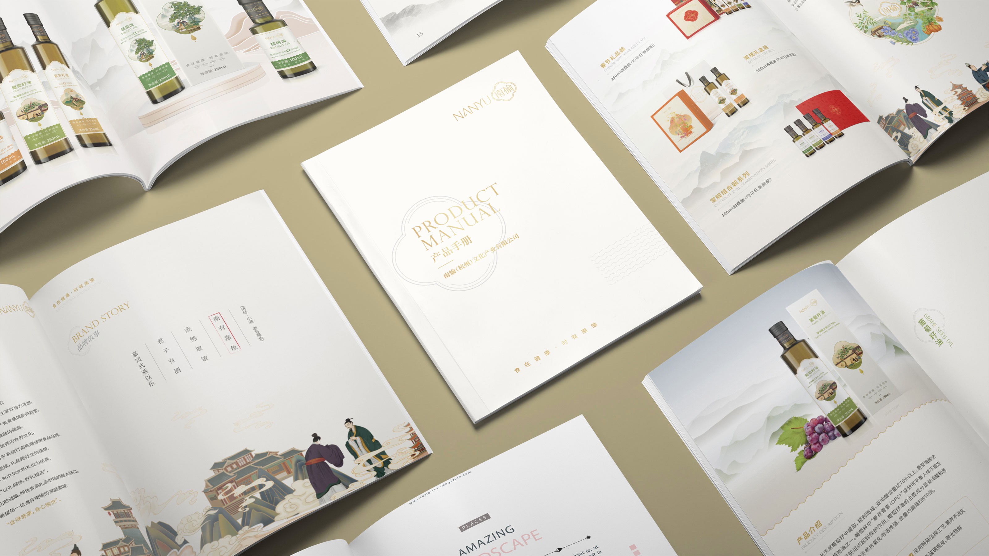 畫冊是企業及產品宣傳的重要表現形式之一,為更能夠突出展現南愉品牌的形象,石特進行了深入的思考。在畫冊的設計中,石特結合南榆自身的品牌定位以及產品特性,決定將中國傳統文化融入其中。封面采用金色字體描出品牌logo和定位語,簡潔大氣,到了講品牌故事的頁面,一個原創手繪插畫故事進入你的視線,令人欣喜的是,故事中人物的舉手投足之間滿是傳統禮儀的縮影,這與南愉的“以禮相待”非常契合,這還不夠,在后續品牌文化的闡釋以及產品的介紹中,傳統水墨作為背景點綴其中,無一不顯現傳統文化的獨特魅力,圖文的排版輕松自然,提升了人們對葡萄籽油、核桃油以及亞麻籽油產品的閱讀興趣,將“食在健康,時有南愉”體現的淋漓盡致。